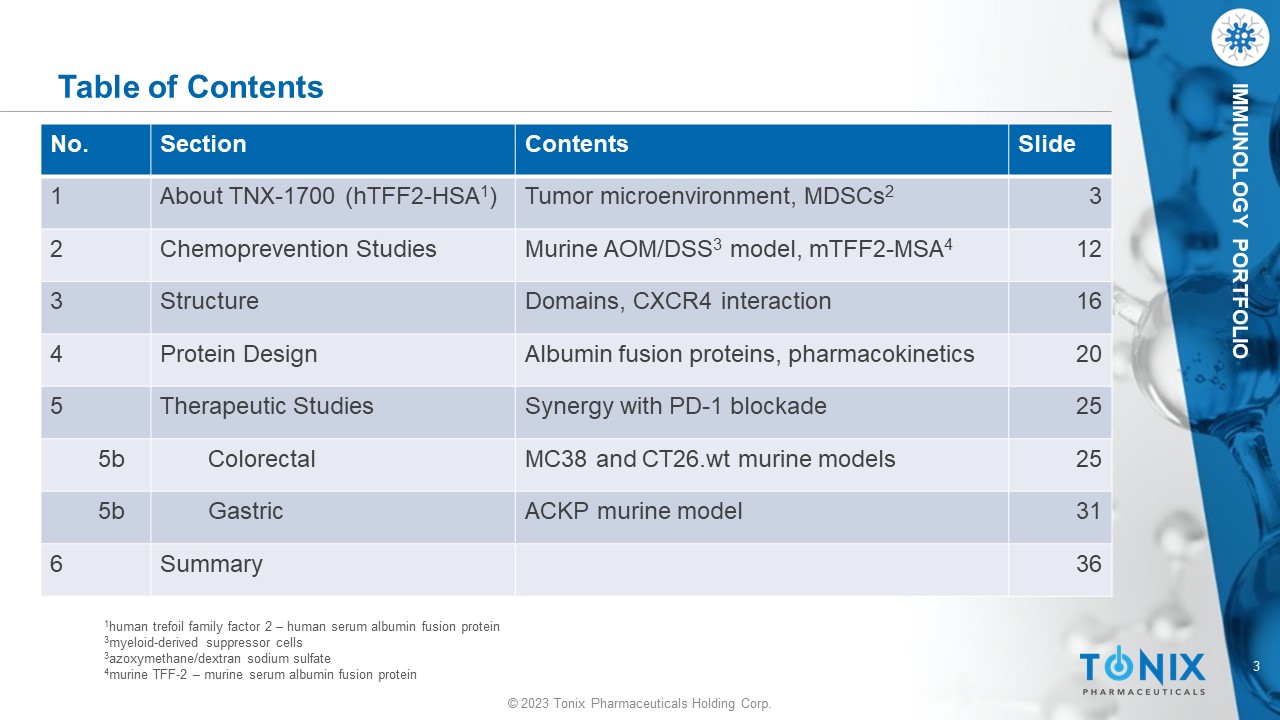 © 2023 Tonix Pharmaceuticals Holding Corp. 3 © 2023 Tonix Pharmaceuticals Holding Corp. IMMUNOLOGY PORTFOLIO Table of Contents Slide Contents Section No. 3 Tumor microenvironment, MDSCs 2 About TNX - 1700 (hTFF2 - HSA 1 ) 1 12 Murine AOM/DSS 3 model, mTFF2 - MSA 4 Chemoprevention Studies 2 16 Domains, CXCR4 interaction Structure 3 20 Albumin fusion proteins, pharmacokinetics Protein Design 4 25 Synergy with PD - 1 blockade Therapeutic Studies 5 25 MC38 and CT26.wt murine models Colorectal 5b 31 ACKP murine model Gastric 5b 36 Summary 6 1 human trefoil family factor 2 – human serum albumin fusion protein 3 myeloid - derived suppressor cells 3 azoxymethane/dextran sodium sulfate 4 murine TFF - 2 – murine serum albumin fusion protein