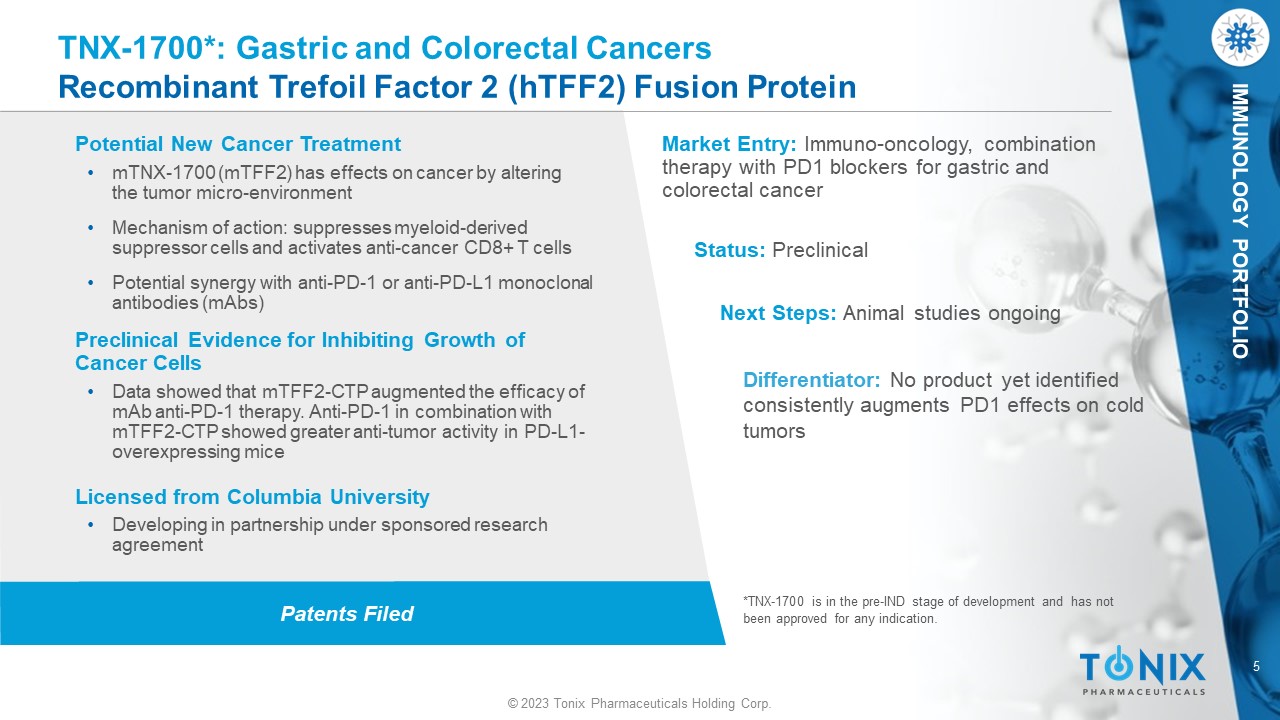 © 2023 Tonix Pharmaceuticals Holding Corp. 40 © 2023 Tonix Pharmaceuticals Holding Corp. IMMUNOLOGY PORTFOLIO Patents Filed TNX - 1700*: Gastric and Colorectal Cancers Recombinant Trefoil Factor 2 (rTFF2) Fusion Protein Potential New Cancer Treatment • TNX - 1700 (rTFF2) has effects on cancer by altering the tumor micro - environment • Mechanism of action: suppresses myeloid - derived suppressor cells and activates anti - cancer CD8+ T cells • Potential synergy with anti - PD - 1 or anti - PD - L1 monoclonal antibodies ( mAbs ) Preclinical Evidence for Inhibiting Growth of Cancer Cells • Data showed that TFF2 - CTP augmented the efficacy of mAb anti - PD - 1 therapy. Anti - PD - 1 in combination with TFF2 - CTP showed greater anti - tumor activity in PD - L1 - overexpressing mice Licensed from Columbia University • Developing in partnership under sponsored research agreement Market Entry: Immuno - oncology, combination therapy with PD1 blockers for gastric and colorectal cancer Status: Preclinical Next Steps: Animal studies ongoing *TNX - 1700 is in the pre - IND stage of development and has not been approved for any indication. Differentiator: No product yet identified consistently augments PD1 effects on cold tumors
