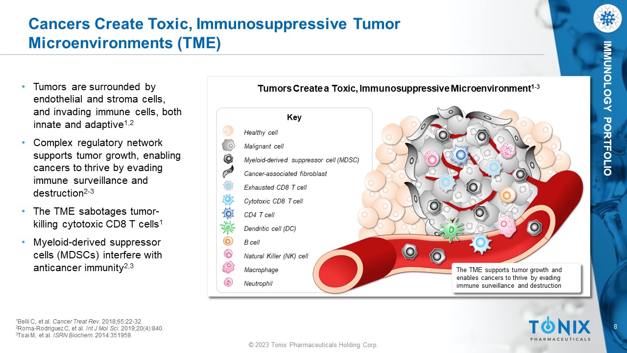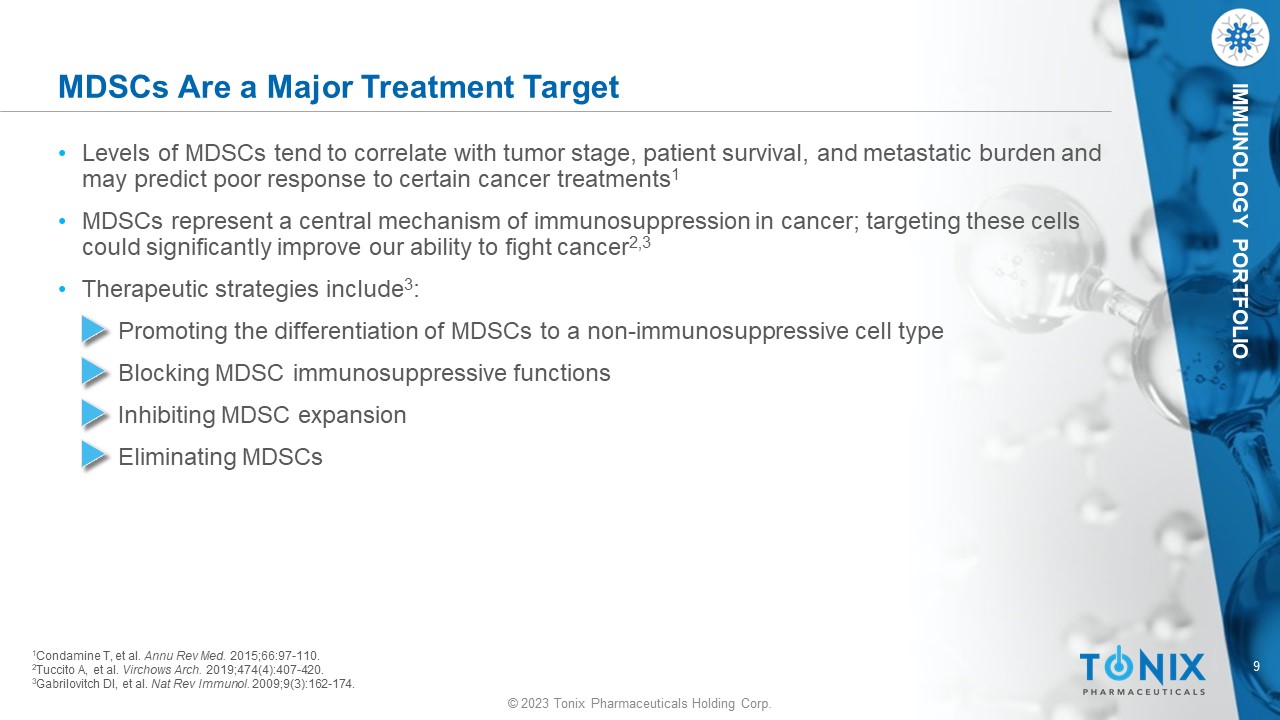 © 2023 Tonix Pharmaceuticals Holding Corp. 8 © 2023 Tonix Pharmaceuticals Holding Corp. IMMUNOLOGY PORTFOLIO Cancers Create Toxic, Immunosuppressive Tumor Microenvironments (TME) • Tumors are surrounded by endothelial and stroma cells, and invading immune cells, both innate and adaptive 1,2 • Complex regulatory network supports tumor growth, enabling cancers to thrive by evading immune surveillance and destruction 2 - 3 • The TME sabotages tumor - killing cytotoxic CD8 T cells 1 • Myeloid - derived suppressor cells (MDSCs) interfere with anticancer immunity 2,3 1 Belli C, et al. Cancer Treat Rev. 2018;65:22 - 32. 2 Roma - Rodriguez C, et al. Int J Mol Sci. 2019;20(4):840. 3 Tsai M, et al. ISRN Biochem . 2014:351959. Tumors Create a Toxic, Immunosuppressive Microenvironment 1 - 3 Key The TME supports tumor growth and enables cancers to thrive by evading immune surveillance and destruction Healthy cell Malignant cell Myeloid - derived suppressor cell (MDSC) Cancer - associated fibroblast Exhausted CD8 T cell Cytotoxic CD8 T cell CD4 T cell Dendritic cell (DC) B cell Natural Killer (NK) cell Macrophage Neutrophil