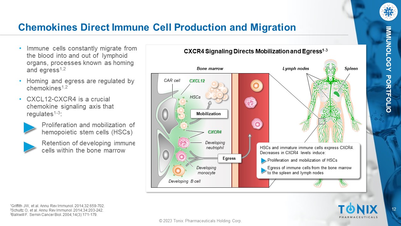 © 2023 Tonix Pharmaceuticals Holding Corp. 11 © 2023 Tonix Pharmaceuticals Holding Corp. IMMUNOLOGY PORTFOLIO TFF2 Signals Through CXCR4 • Importantly, TFF2 activates CXCR4 and may therefore modulate immune and tumorigenic responses, specifically by reducing the expansion or migration of immunosuppressive MDSCs 1 - 3 • TFF2 upregulates ApoE fifty - fold in myeloid progenitor cells; ApoE has been shown to suppress MDSCs 4 TFF2 Modulates MDSC Function via CXCR4 Signaling 1 - 3 Migration Proliferation Survival TFF2 CXCR4 MDSC cell membrane 1 Dubeykovskaya Z, et al. J Biol Chem. 2009;284(6):3650 - 3662. 2 Balkwill F. Semin Cancer Biol. 2004;14(3):171 - 179. 3 Teixidó J, et al. Int J Biochem Cell Biol. 2018;95:121 - 131. 4 Tavazoie MF et al, Cell 2018; 172:825 - 840.