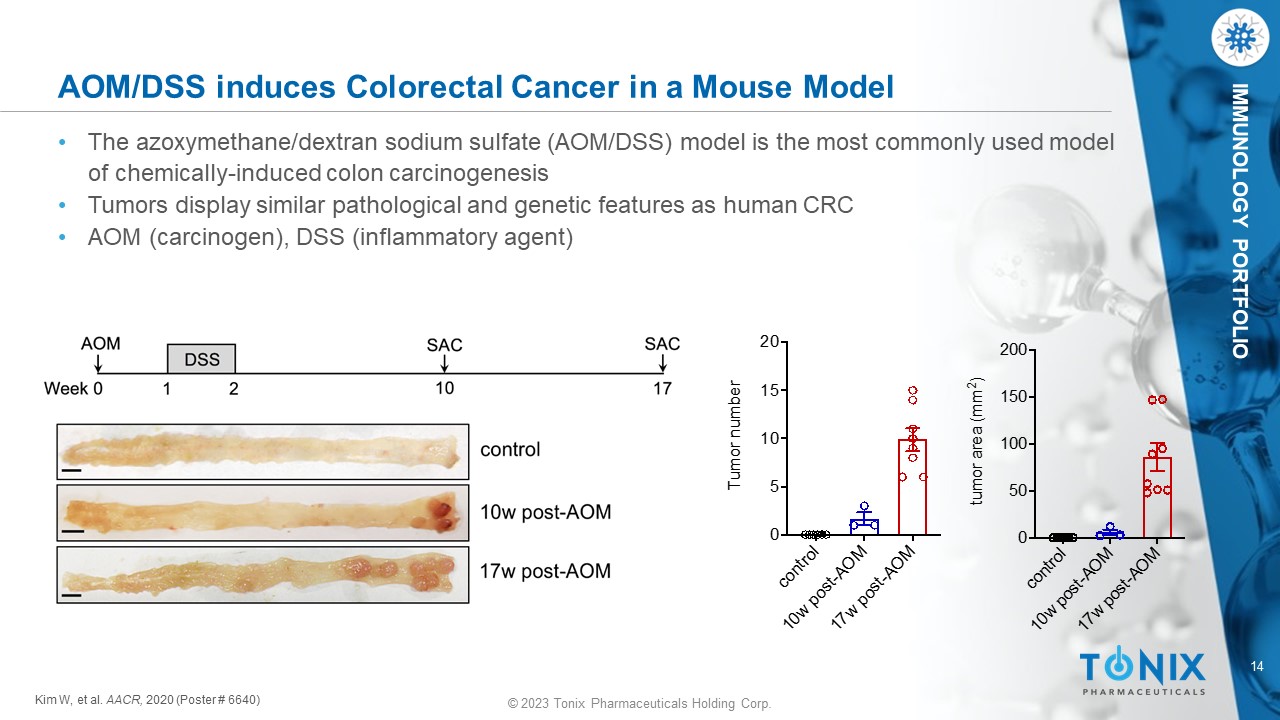 © 2023 Tonix Pharmaceuticals Holding Corp. 14 © 2023 Tonix Pharmaceuticals Holding Corp. IMMUNOLOGY PORTFOLIO AOM/DSS induces Colorectal Cancer in a Mouse Model • The azoxymethane/dextran sodium sulfate (AOM/DSS) model is the most commonly used model of chemically - induced colon carcinogenesis • Tumors display similar pathological and genetic features as human CRC • AOM (carcinogen), DSS (inflammatory agent) c o n t r o l 1 0 w p o s t - A O M 1 7 w p o s t - A O M 0 5 10 15 20 T u m o r n u m b e r Kim W, et al. AACR, 2020 (Poster # 6640)
