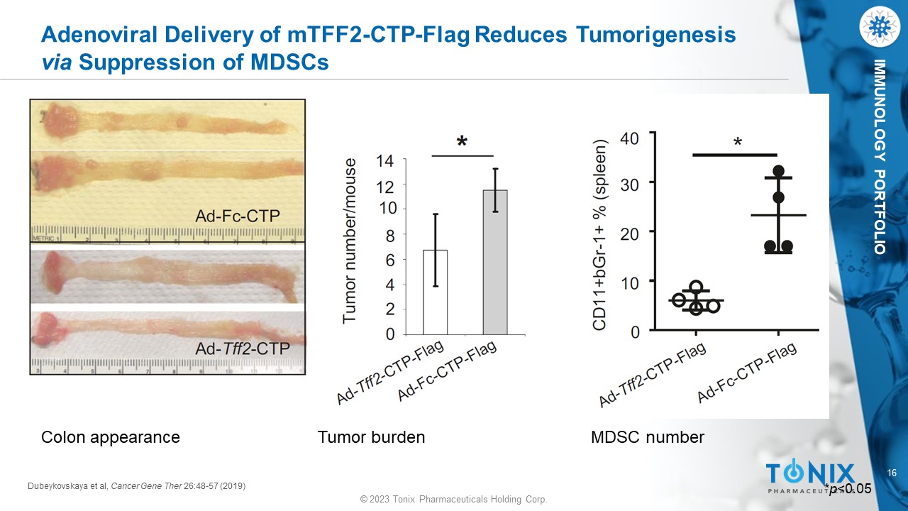 © 2023 Tonix Pharmaceuticals Holding Corp. 15 © 2023 Tonix Pharmaceuticals Holding Corp. IMMUNOLOGY PORTFOLIO Transgenic Overexpression of mTFF2 Reduces Tumorigenesis via Suppression of MDSCs Dubeykovskaya Z, et al. Nat Commun . 2016 7:1 - 11 MDSC number Colon appearance Tumor burden * p <0.05, ** p <0.01, *** p <0.001, **** p <0.0001