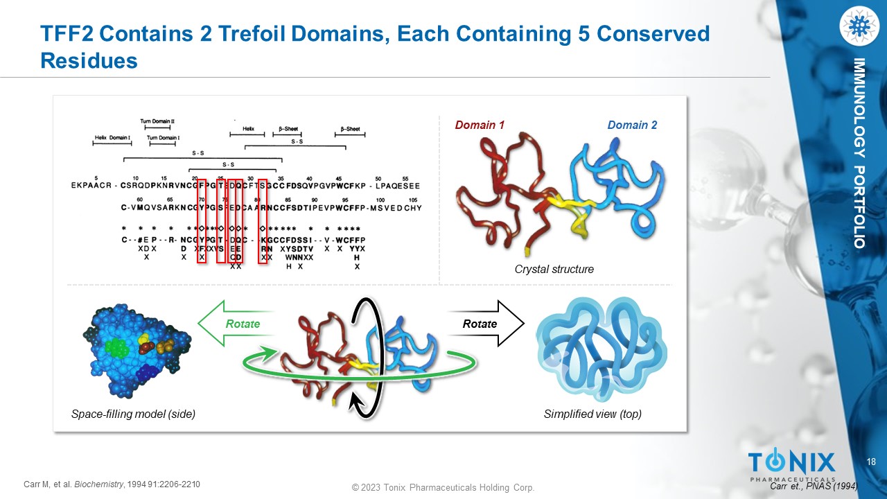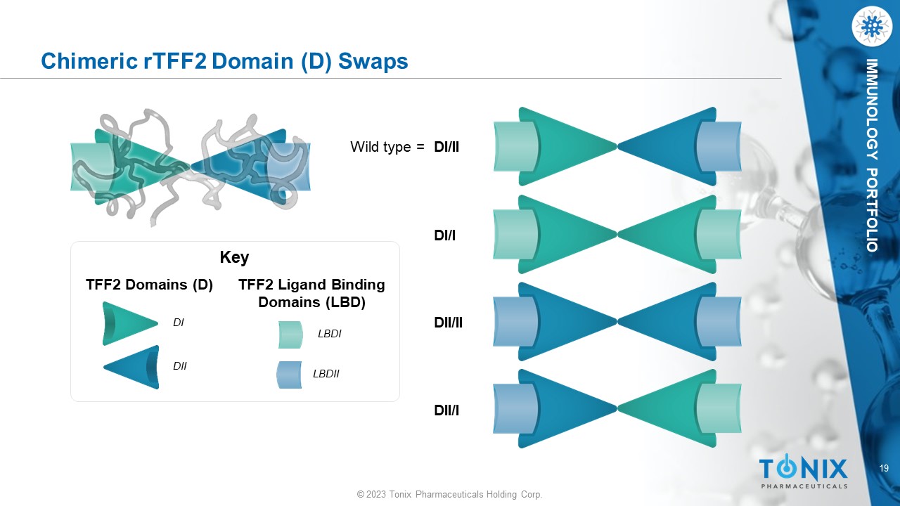 © 2023 Tonix Pharmaceuticals Holding Corp. 18 © 2023 Tonix Pharmaceuticals Holding Corp. IMMUNOLOGY PORTFOLIO TFF2 Contains 2 Trefoil Domains, Each Containing 5 Conserved Residues Carr et., PNAS (1994) Crystal structure Simplified view (top) Rotate Rotate Space - filling model (side) Domain 1 Domain 2 Carr M, et al. Biochemistry , 1994 91:2206 - 2210