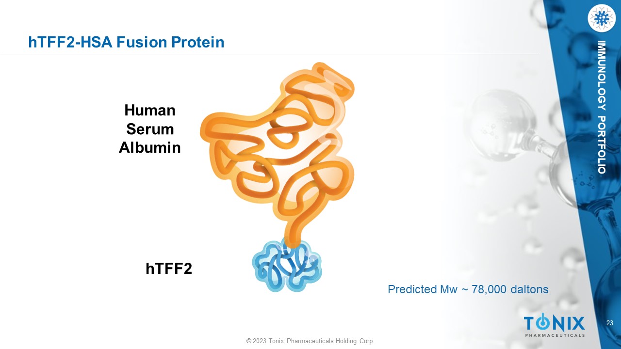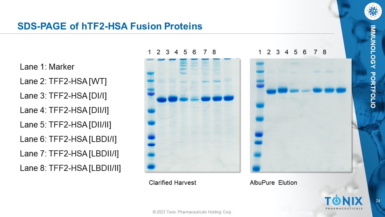 © 2023 Tonix Pharmaceuticals Holding Corp. 23 © 2023 Tonix Pharmaceuticals Holding Corp. IMMUNOLOGY PORTFOLIO hTFF2 - HSA Fusion Protein hTFF2 Human Serum Albumin Predicted Mw ~ 78,000 daltons