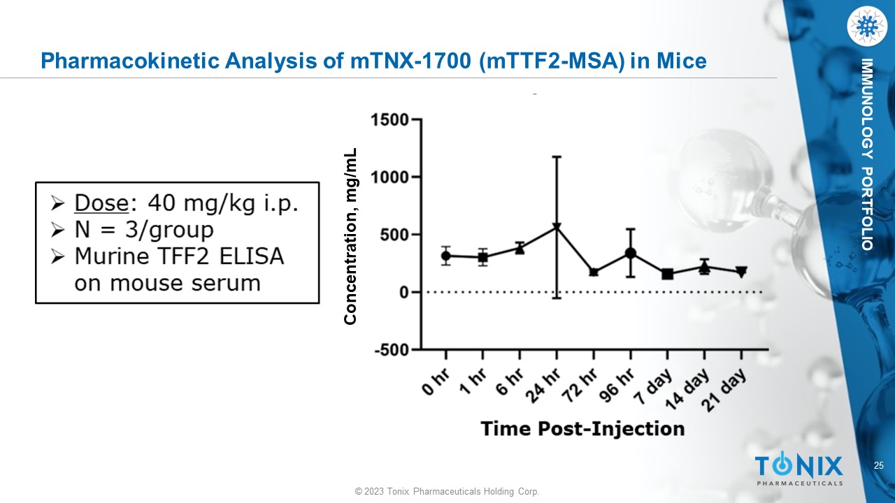 © 2023 Tonix Pharmaceuticals Holding Corp. 24 © 2023 Tonix Pharmaceuticals Holding Corp. IMMUNOLOGY PORTFOLIO SDS - PAGE of hTF2 - HSA Fusion Proteins Lane 1: Marker Lane 2: TFF2 - HSA [WT] Lane 3: TFF2 - HSA [DI/I] Lane 4: TFF2 - HSA [DII/I] Lane 5: TFF2 - HSA [DII/II] Lane 6: TFF2 - HSA [LBDI/I] Lane 7: TFF2 - HSA [LBDII/I] Lane 8: TFF2 - HSA [LBDII/II] 1 2 3 4 5 6 7 8 1 2 3 4 5 6 7 8 Clarified Harvest AlbuPure Elution