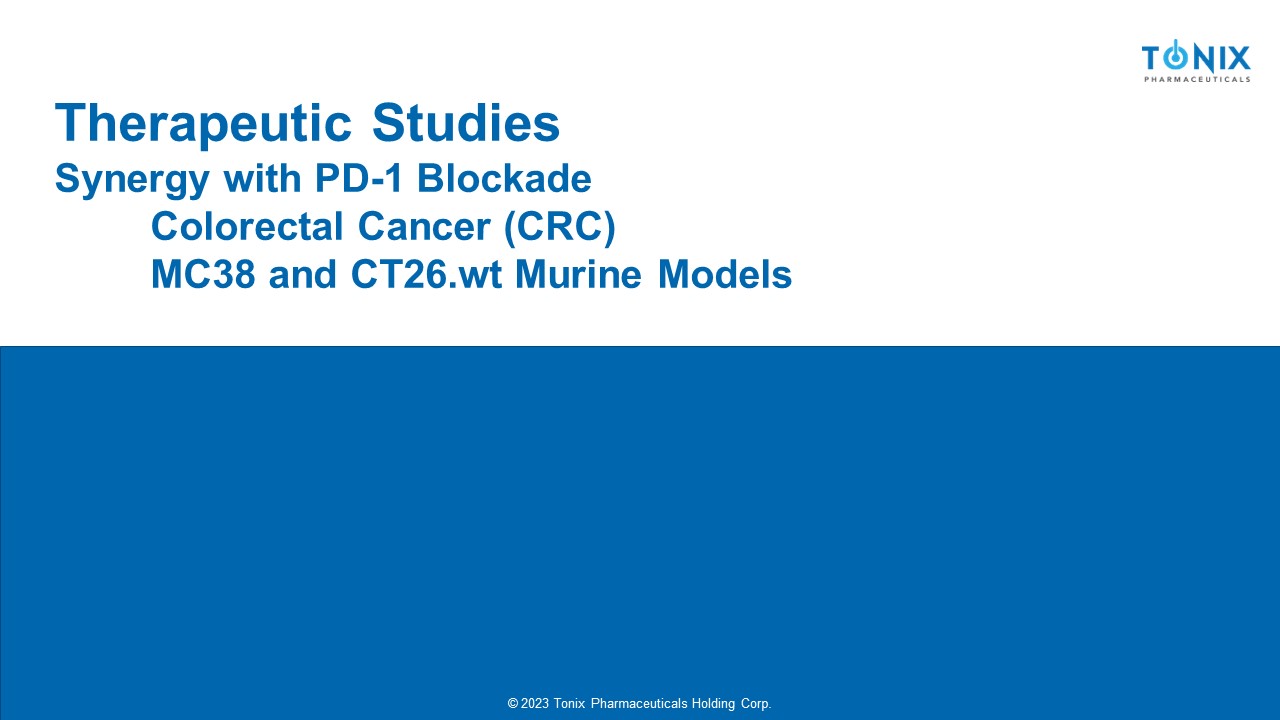 © 2023 Tonix Pharmaceuticals Holding Corp. © 2023 Tonix Pharmaceuticals Holding Corp. Therapeutic Studies Synergy with PD - 1 Blockade Colorectal Cancer (CRC) MC38 and CT26.wt Murine Models