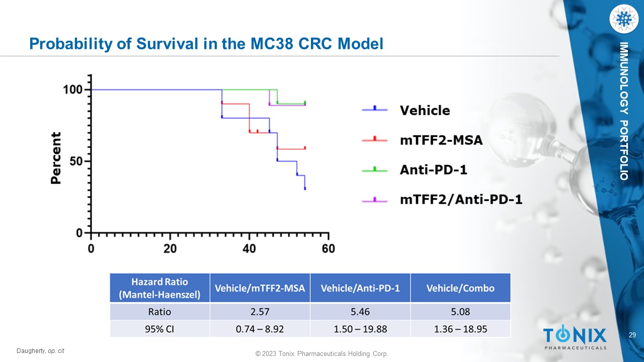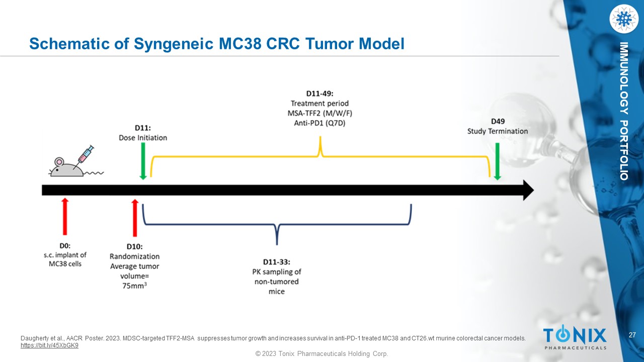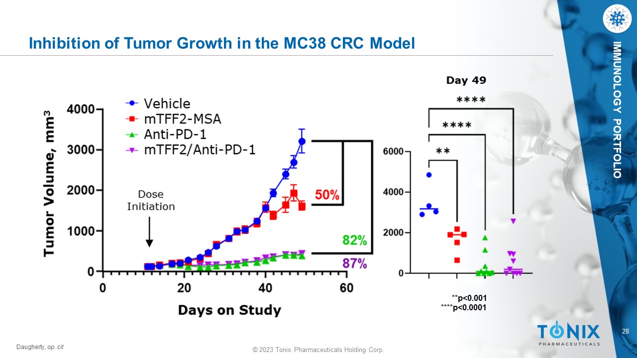 © 2023 Tonix Pharmaceuticals Holding Corp. 27 © 2023 Tonix Pharmaceuticals Holding Corp. IMMUNOLOGY PORTFOLIO Schematic of Syngeneic MC38 CRC Tumor Model Daugherty et al., AACR Poster. 2023. MDSC - targeted TFF2 - MSA suppresses tumor growth and increases survival in anti - PD - 1 treated MC38 and CT26.wt murine colorectal ca ncer models. https://bit.ly/45XbGK9