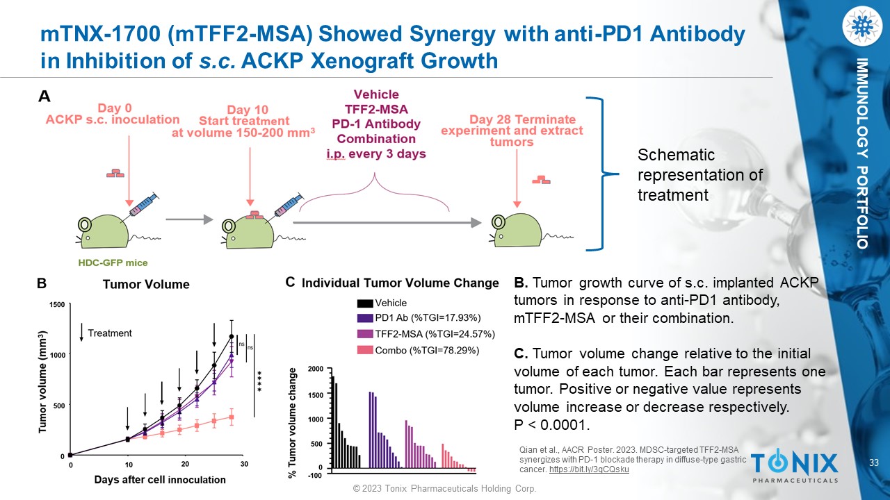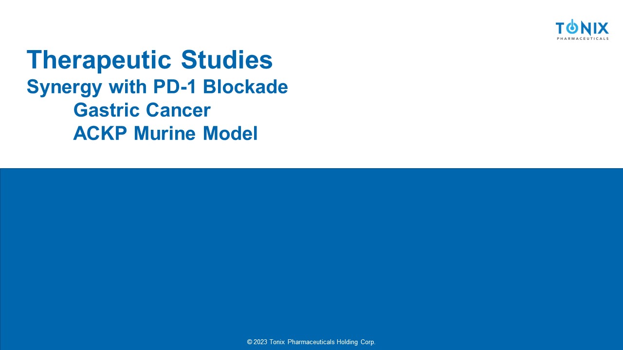© 2023 Tonix Pharmaceuticals Holding Corp. © 2023 Tonix Pharmaceuticals Holding Corp. Therapeutic Studies Synergy with PD - 1 Blockade Gastric Cancer ACKP Murine Model