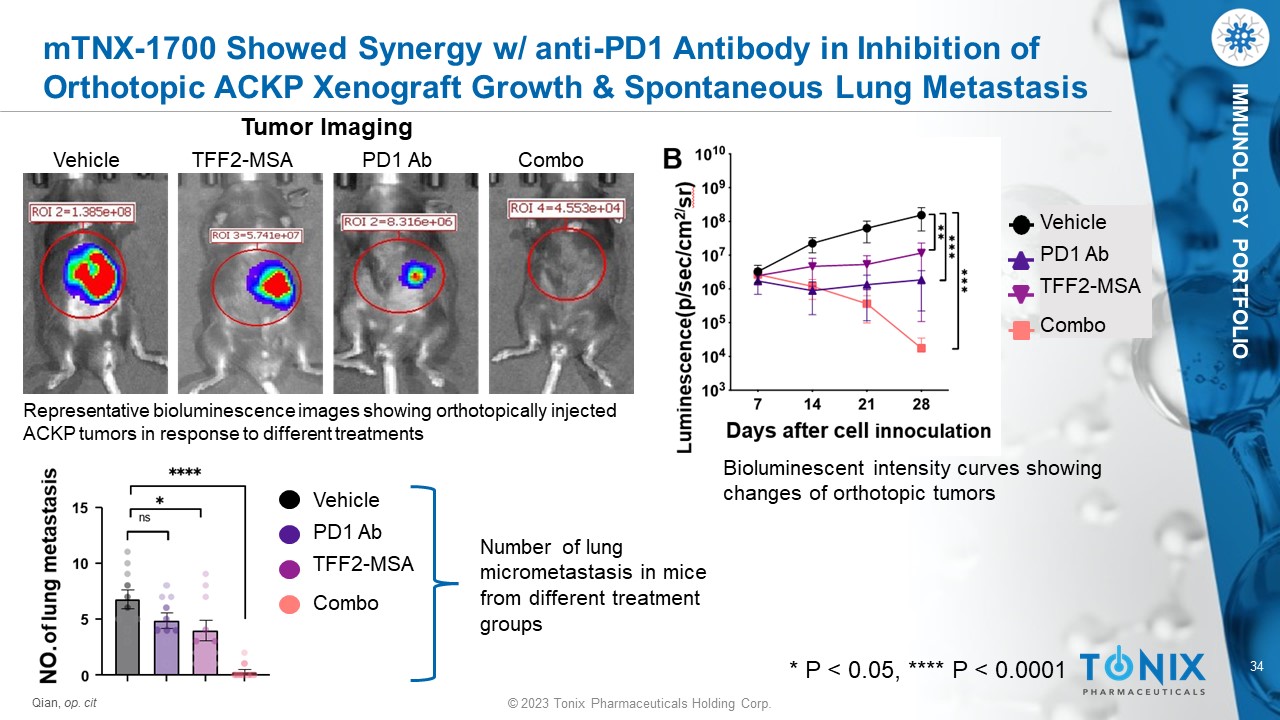 © 2023 Tonix Pharmaceuticals Holding Corp. 33 © 2023 Tonix Pharmaceuticals Holding Corp. IMMUNOLOGY PORTFOLIO mTNX - 1700 (mTFF2 - MSA) Showed Synergy with anti - PD1 Antibody in Inhibition of s.c. ACKP Xenograft Growth B. Tumor growth curve of s.c. implanted ACKP tumors in response to anti - PD1 antibody, mTFF2 - MSA or their combination. C. Tumor volume change relative to the initial volume of each tumor. Each bar represents one tumor. Positive or negative value represents volume increase or decrease respectively. P < 0.0001. Schematic representation of treatment Qian et al., AACR Poster. 2023. MDSC - targeted TFF2 - MSA synergizes with PD - 1 blockade therapy in diffuse - type gastric cancer. https://bit.ly/3qCQsku