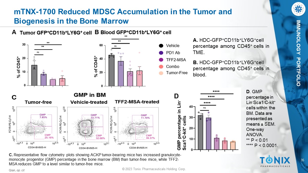© 2023 Tonix Pharmaceuticals Holding Corp. 35 © 2023 Tonix Pharmaceuticals Holding Corp. IMMUNOLOGY PORTFOLIO mTNX - 1700 Reduced MDSC Accumulation in the Tumor and Biogenesis in the Bone Marrow A. HDC - GFP + CD11b + LY6G + cell percentage among CD45 + cells in TME. B. HDC - GFP + CD11b + LY6G + cell percentage among CD45 + cells in blood. D . GMP percentage in Lin - Sca1 - C - kit + cells within the BM. Data are presented as means ± SEM. One - way ANOVA. ** P < 0.01 **** P < 0.0001. C. Representative flow cytometry plots showing ACKP tumor - bearing mice has increased granulocyte - monocyte progenitor (GMP) percentage in the bone marrow (BM) than tumor - free mice, while TFF2 - MSA reduces GMP to a level similar to tumor - free mice. Qian, op. cit