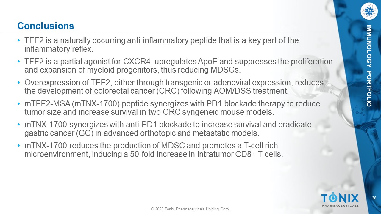 © 2023 Tonix Pharmaceuticals Holding Corp. 38 © 2023 Tonix Pharmaceuticals Holding Corp. IMMUNOLOGY PORTFOLIO Conclusions • TFF2 is a naturally occurring anti - inflammatory peptide that is a key part of the inflammatory reflex. • TFF2 is a partial agonist for CXCR4, upregulates ApoE and suppresses the proliferation and expansion of myeloid progenitors, thus reducing MDSCs. • Overexpression of TFF2, either through transgenic or adenoviral expression, reduces the development of colorectal cancer (CRC) following AOM/DSS treatment. • mTFF2 - MSA (mTNX - 1700) peptide synergizes with PD1 blockade therapy to reduce tumor size and increase survival in two CRC syngeneic mouse models. • mTNX - 1700 synergizes with anti - PD1 blockade to increase survival and eradicate gastric cancer (GC) in advanced orthotopic and metastatic models. • mTNX - 1700 reduces the production of MDSC and promotes a T - cell rich microenvironment, inducing a 50 - fold increase in intratumor CD8+ T cells.