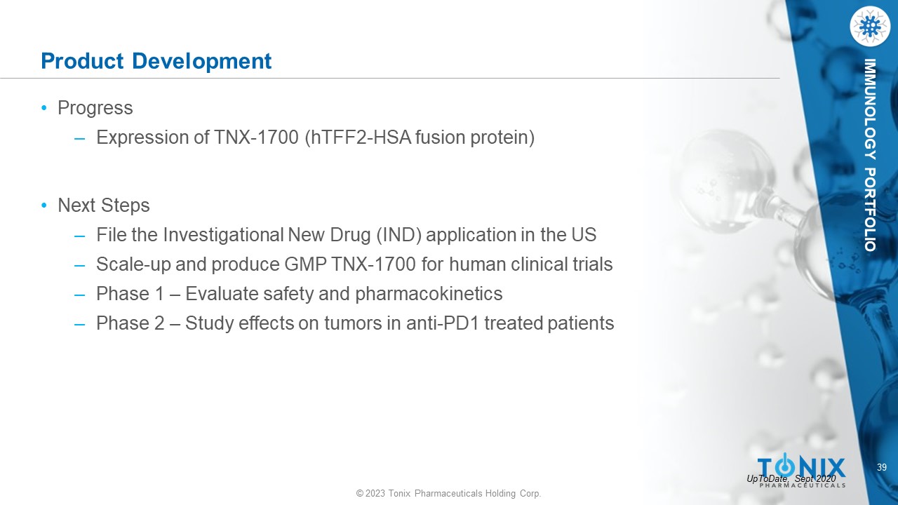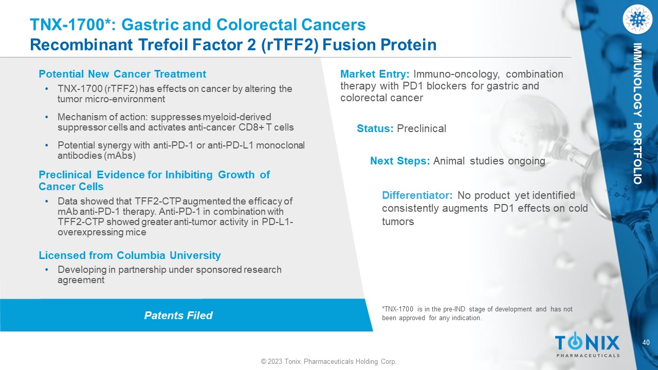 © 2023 Tonix Pharmaceuticals Holding Corp. 39 © 2023 Tonix Pharmaceuticals Holding Corp. IMMUNOLOGY PORTFOLIO Product Development • Progress ‒ Expression of TNX - 1700 (hTFF2 - HSA fusion protein) • Next Steps ‒ File the Investigational New Drug (IND) application in the US ‒ Scale - up and produce GMP TNX - 1700 for human clinical trials ‒ Phase 1 – Evaluate safety and pharmacokinetics ‒ Phase 2 – Study effects on tumors in anti - PD1 treated patients UpToDate, Sept 2020