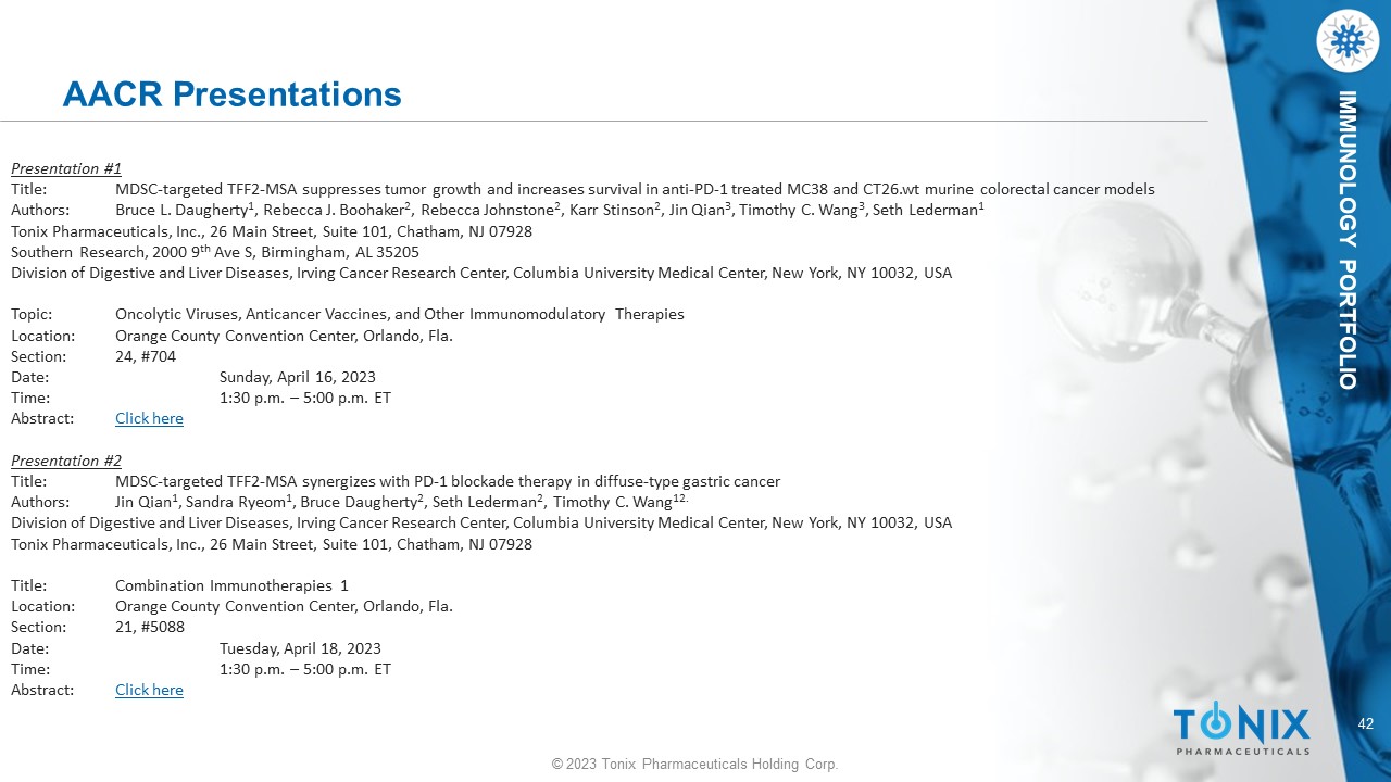 © 2023 Tonix Pharmaceuticals Holding Corp. 42 © 2023 Tonix Pharmaceuticals Holding Corp. IMMUNOLOGY PORTFOLIO AACR Presentations Presentation # 1 Title: MDSC - targeted TFF2 - MSA suppresses tumor growth and increases survival in anti - PD - 1 treated MC38 and CT26.wt murine color ectal cancer models Authors: Bruce L. Daugherty 1 , Rebecca J. Boohaker 2 , Rebecca Johnstone 2 , Karr Stinson 2 , Jin Qian 3 , Timothy C. Wang 3 , Seth Lederman 1 Tonix Pharmaceuticals, Inc., 26 Main Street, Suite 101, Chatham, NJ 07928 Southern Research, 2000 9 th Ave S, Birmingham, AL 35205 Division of Digestive and Liver Diseases, Irving Cancer Research Center, Columbia University Medical Center, New York, NY 100 32, USA Topic: Oncolytic Viruses, Anticancer Vaccines, and Other Immunomodulatory Therapies Location: Orange County Convention Center, Orlando, Fla. Section: 24, #704 Date: Sunday, April 16, 2023 Time: 1:30 p.m. – 5:00 p.m. ET Abstract: Click here Presentation #2 Title : MDSC - targeted TFF 2 - MSA synergizes with PD - 1 blockade therapy in diffuse - type gastric cancer Authors: Jin Qian 1 , Sandra Ryeom 1 , Bruce Daugherty 2 , Seth Lederman 2 , Timothy C. Wang 12. Division of Digestive and Liver Diseases, Irving Cancer Research Center, Columbia University Medical Center, New York, NY 100 32, USA Tonix Pharmaceuticals, Inc., 26 Main Street, Suite 101, Chatham, NJ 07928 Title: Combination Immunotherapies 1 Location: Orange County Convention Center, Orlando, Fla. Section: 21, #5088 Date: Tuesday, April 18, 2023 Time: 1:30 p.m. – 5:00 p.m. ET Abstract: Click here