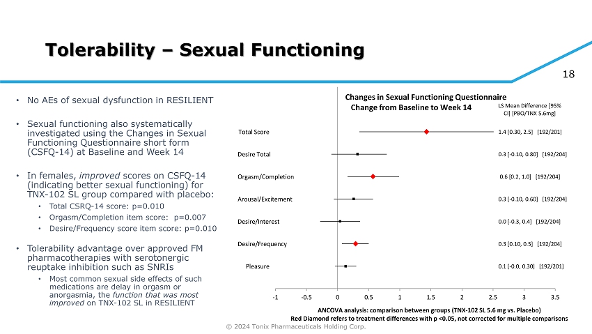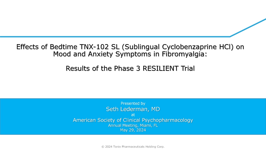 © 2024 Tonix Pharmaceuticals Holding Corp. Presented by Seth Lederman, MD at American Society of Clinical Psychopharmacology Annual Meeting, Miami, FL May 29, 2024 Effects of Bedtime TNX - 102 SL (Sublingual Cyclobenzaprine HCl) on Mood and Anxiety Symptoms in Fibromyalgia: Results of the Phase 3 RESILIENT Trial