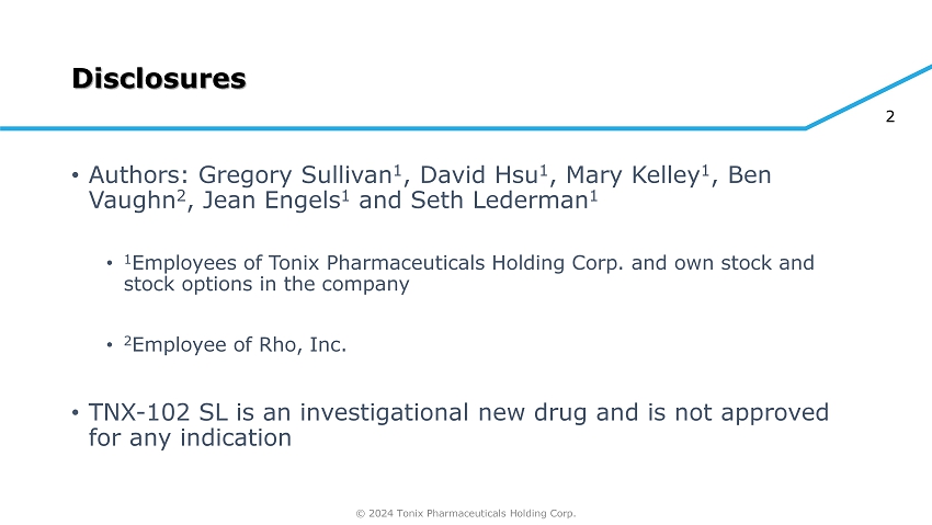 © 2024 Tonix Pharmaceuticals Holding Corp. 2 Disclosures • Authors: Gregory Sullivan 1 , David Hsu 1 , Mary Kelley 1 , Ben Vaughn 2 , Jean Engels 1 and Seth Lederman 1 • 1 Employees of Tonix Pharmaceuticals Holding Corp. and own stock and stock options in the company • 2 Employee of Rho, Inc. • TNX - 102 SL is an investigational new drug and is not approved for any indication