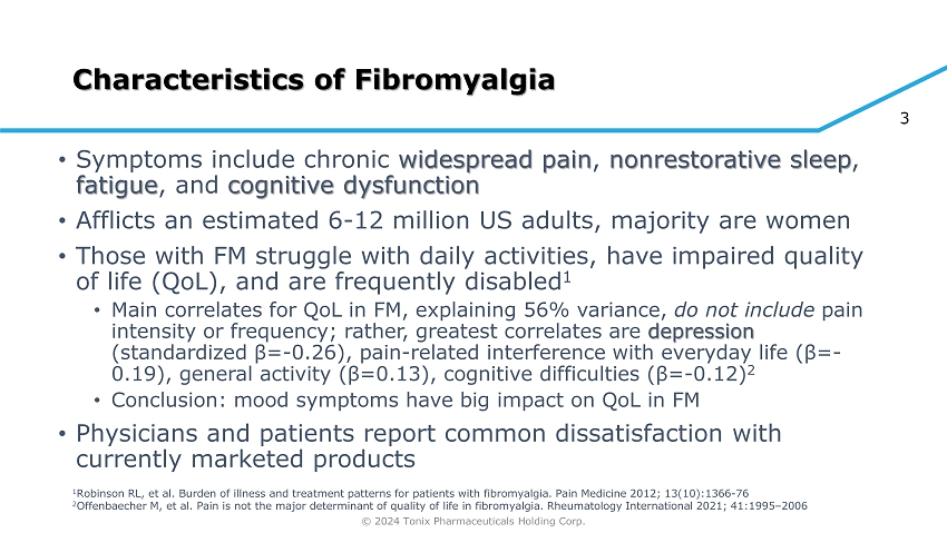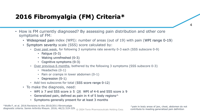 © 2024 Tonix Pharmaceuticals Holding Corp. 3 Characteristics of Fibromyalgia • Symptoms include chronic widespread pain , nonrestorative sleep , fatigue , and cognitive dysfunction • Afflicts an estimated 6 - 12 million US adults, majority are women • Those with FM struggle with daily activities, have impaired quality of life (QoL), and are frequently disabled 1 • Main correlates for QoL in FM, explaining 56% variance, do not include pain intensity or frequency; rather, greatest correlates are depression (standardized β = - 0.26), pain - related interference with everyday life ( β = - 0.19), general activity ( β =0.13), cognitive difficulties ( β = - 0.12) 2 • Conclusion: mood symptoms have big impact on QoL in FM • Physicians and patients report common dissatisfaction with currently marketed products 1 Robinson RL, et al. Burden of illness and treatment patterns for patients with fibromyalgia. Pain Medicine 2012; 13(10):1366 - 76 2 Offenbaecher M, et al. Pain is not the major determinant of quality of life in fibromyalgia. Rheumatology International 2021; 41:1995 – 2006