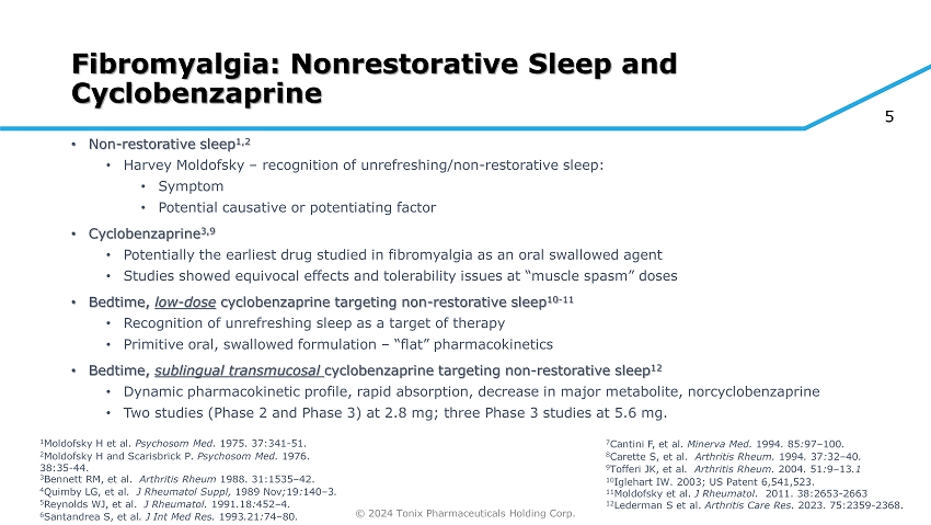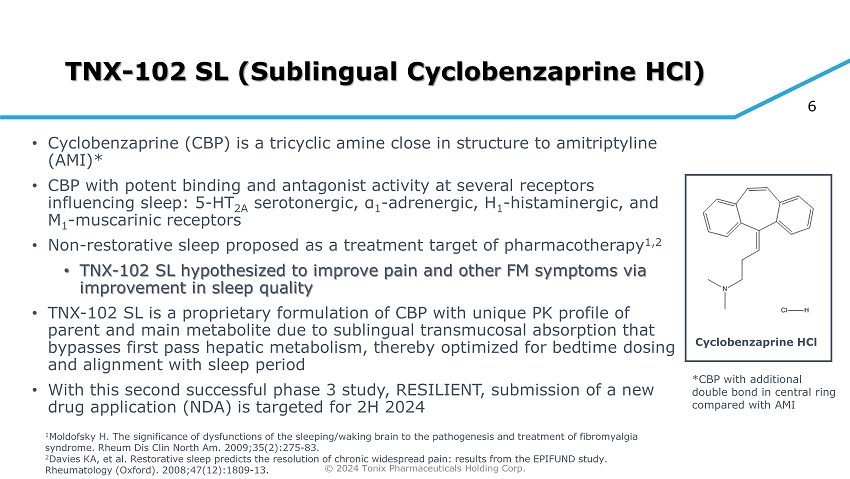 © 2024 Tonix Pharmaceuticals Holding Corp. 5 Fibromyalgia: Nonrestorative Sleep and Cyclobenzaprine • Non - restorative sleep 1,2 • Harvey Moldofsky – recognition of unrefreshing/non - restorative sleep: • Symptom • P otential causative or potentiating factor • Cyclobenzaprine 3,9 • Potentially the earliest drug studied in fibromyalgia as an oral swallowed agent • Studies showed equivocal effects and tolerability issues at “muscle spasm” doses • Bedtime, low - dose cyclobenzaprine targeting non - restorative sleep 10 - 11 • Recognition of unrefreshing sleep as a target of therapy • Primitive oral, swallowed formulation – “flat” pharmacokinetics • Bedtime, sublingual transmucosal cyclobenzaprine targeting non - restorative sleep 12 • Dynamic pharmacokinetic profile, rapid absorption, decrease in major metabolite, norcyclobenzaprine • Two studies (Phase 2 and Phase 3) at 2.8 mg; three Phase 3 studies at 5.6 mg. 1 Moldofsky H et al. Psychosom Med. 1975. 37:341 - 51. 2 Moldofsky H and Scarisbrick P. Psychosom Med. 1976. 38:35 - 44. 3 Bennett RM, et al. Arthritis Rheum 1988 . 31 : 1535 – 42 . 4 Quimby LG, et al . J Rheumatol Suppl, 1989 Nov ; 19 : 140 – 3 . 5 Reynolds WJ, et al. J Rheumatol . 1991 . 18 : 452 – 4 . 6 Santandrea S, et al . J Int Med Res. 1993 . 21 : 74 – 80 . 7 Cantini F, et al . Minerva Med. 1994 . 85 : 97 – 100 . 8 Carette S, et al. Arthritis Rheum. 1994 . 37 : 32 – 40 . 9 Tofferi JK, et al . Arthritis Rheum. 2004 . 51 : 9 – 13 . 1 10 Iglehart IW. 2003; US Patent 6,541,523. 11 Moldofsky et al. J Rheumatol . 2011. 38:2653 - 2663 12 Lederman S et al. Arthritis Care Res . 2023. 75:2359 - 2368 .