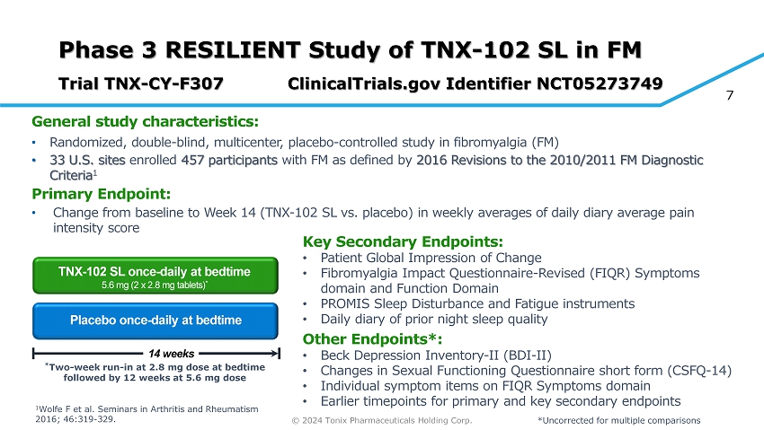 © 2024 Tonix Pharmaceuticals Holding Corp. 6 TNX - 102 SL (Sublingual Cyclobenzaprine HCl) • Cyclobenzaprine (CBP) is a tricyclic amine close in structure to amitriptyline (AMI)* • CBP with potent binding and antagonist activity at several receptors influencing sleep: 5 - HT 2A serotonergic, α 1 - adrenergic, H 1 - histaminergic, and M 1 - muscarinic receptors • Non - restorative sleep proposed as a treatment target of pharmacotherapy 1,2 • TNX - 102 SL hypothesized to improve pain and other FM symptoms via improvement in sleep quality • TNX - 102 SL is a proprietary formulation of CBP with unique PK profile of parent and main metabolite due to sublingual transmucosal absorption that bypasses first pass hepatic metabolism, thereby optimized for bedtime dosing and alignment with sleep period • With this second successful phase 3 study, RESILIENT, submission of a new drug application (NDA) is targeted for 2H 2024 Cyclobenzaprine HCl *CBP with additional double bond in central ring compared with AMI 1 Moldofsky H. The significance of dysfunctions of the sleeping/waking brain to the pathogenesis and treatment of fibromyalgia syndrome. Rheum Dis Clin North Am. 2009;35(2):275 - 83. 2 Davies KA, et al. Restorative sleep predicts the resolution of chronic widespread pain: results from the EPIFUND study. Rheumatology (Oxford). 2008;47(12):1809 - 13.