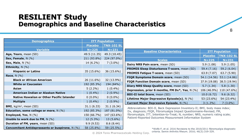© 2024 Tonix Pharmaceuticals Holding Corp. 7 Phase 3 RESILIENT Study of TNX - 102 SL in FM Trial TNX - CY - F307 ClinicalTrials.gov Identifier NCT05273749 General s tudy c haracteristics: • Randomized, double - blind, multicenter, placebo - controlle d study in fibromyalgia (FM) • 33 U.S. sites enrolled 457 participants with FM as defined by 2016 Revisions to the 2010/2011 FM Diagnostic C riteria 1 Primary Endpoint: • Change from baseline to Week 14 (TNX - 102 SL vs. placebo) in weekly averages of daily diary average pain intensity score Placebo once - daily at bedtime TNX - 102 SL once - daily at bedtime 5.6 mg (2 x 2.8 mg tablets) * * Two - week run - in at 2.8 mg dose at bedtime followed by 12 weeks at 5.6 mg dose Key Secondary Endpoints: • Patient Global Impression of Change • Fibromyalgia Impact Questionnaire - Revised (FIQR) Symptoms domain and Function Domain • PROMIS Sleep Disturbance and Fatigue instruments • Daily diary of prior night sleep quality Other Endpoints*: • Beck Depression Inventory - II (BDI - II) • Changes in Sexual Functioning Questionnaire short form (CSFQ - 14) • Individual symptom items on FIQR Symptoms domain • Earlier timepoints for primary and key secondary endpoints 14 weeks *Uncorrected for multiple comparisons 1 Wolfe F et al. Seminars in Arthritis and Rheumatism 2016; 46:319 - 329.