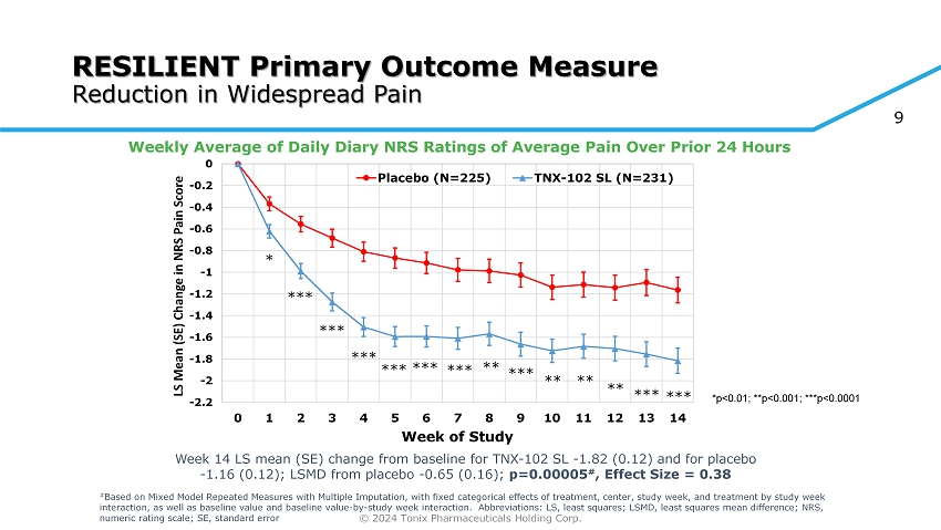 © 2024 Tonix Pharmaceuticals Holding Corp. 8 RESILIENT Study Demographics and Baseline Characteristics ITT Population Demographics TNX - 102 SL Placebo N=231 N=225 Variable 49.3 (10.45) 49.5 (11.35) Age, Years , mean (SD) 224 (97.0%) 211 (93.8%) Sex, Female , N (%) 7 (3.0%) 14 (6.2%) Sex, Male , N (%) Ethnicity , N (%) 36 (15.6%) 35 (15.6%) Hispanic or Latino Race , N (%) 32 (13.9%) 26 (11.6%) Black or African American 194 (84%) 192 (85.3%) White or Caucasian 1 (0.4%) 5 (2.2%) Asian 2 (0.9%) 1 (0.4%) American Indian or Alaskan Native 0 (0.0%) 0 (0.0%) Native Hawaiian or Other Pacific Islander 2 (0.9%) 1 (0.4%) Multiple 31.1 (6.34) 31.1 (6.33) BMI , kg/m 2 , mean (SD) 187 (81.0%) 192 (85.3%) Education, some college or more , N (%) 147 (63.6%) 150 (66.7%) Employed, Yes , N (%) 13 (5.6%) 12 (5.3%) Unable to work due to FM , N (%) 8.6 (8.44) 9.9 (9.53) Duration of FM, years , mean (SD) 59 (25.5%) 58 (25.8%) Concomitant Antidepressants or buspirone , N (%) ITT Population Baseline Characteristics TNX - 102 SL Placebo N=231 N=225 Scales 5.9 (1.05) 5.9 (1.08) Dairy NRS Pain score , mean (SD) 59.2 (6.04) 59.4 (7.16) PROMIS Sleep Disturbance T - score , mean (SD) 63.7 (5.90) 63.9 (7.07) PROMIS Fatigue T - score , mean (SD) 53.1 (14.86) 54.1 (14.56) FIQR Symptoms Domain score , mean (SD) 38.5 (19.94) 37.9 (19.08) FIQR Function Domain score , mean (SD) 5.8 (1.30) 5.7 (1.34) Diary NRS Sleep Quality score , mean (SD) 110 (47.6%) 106 (46.9%) Depression, prior 6 months, FM Dx*, Yes , N (%) 9.6 (6.32) 10.0 (6.72) BDI - II total Score , mean (SD) 54 (23.4%) 53 (23.6%) Lifetime Major Depressive Episode(s) , N (%) 7 (3.0%) 3 (1.3%) Current Major Depressive Episode , N (%) Abbreviations: BDI - II, Beck Depression Inventory - II; BMI, body mass index; Dx, diagnosis; FIQR, Fibromyalgia Impact Questionnaire - Revised; FM, fibromyalgia; ITT, Intention - to - Treat; N, number; NRS, numeric rating scale; Patient - Reported Outcomes Measurement Information System *Wolfe F, et al. 2016 Revisions to the 2010/2011 fibromyalgia diagnostic criteria. Semin Arthritis Rheum. 2016; 46(3):319 - 329.