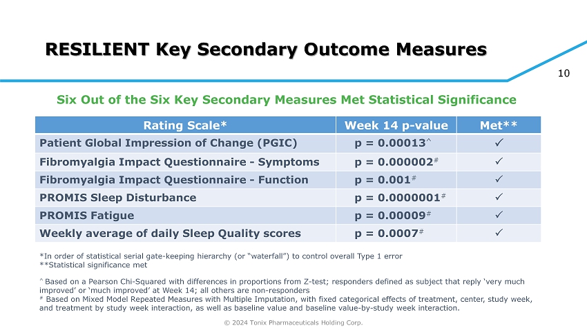 © 2024 Tonix Pharmaceuticals Holding Corp. 9 RESILIENT Primary Outcome Measure Reduction in Widespread Pain Weekly Average of Daily Diary NRS Ratings of Average Pain Over Prior 24 Hours -2.2 -2 -1.8 -1.6 -1.4 -1.2 -1 -0.8 -0.6 -0.4 -0.2 0 0 1 2 3 4 5 6 7 8 9 10 11 12 13 14 LS Mean (SE) Change in NRS Pain Score Week of Study Placebo (N=225) TNX-102 SL (N=231) * *** *** ** ** ** *** *** *** *** *** *** *** ** *p<0.01; **p<0.001; ***p<0.0001 Week 14 LS mean (SE) change from baseline for TNX - 102 SL - 1.82 (0.12) and for placebo - 1.16 (0.12); LSMD from placebo - 0.65 (0.16); p=0.00005 # , Effect Size = 0.38 # Based on Mixed Model Repeated Measures with Multiple Imputation, with fixed categorical effects of treatment, center, study w eek , and treatment by study week interaction, as well as baseline value and baseline value - by - study week interaction. Abbreviations: LS, least squares; LSMD, le ast squares mean difference; NRS, numeric rating scale; SE, standard error