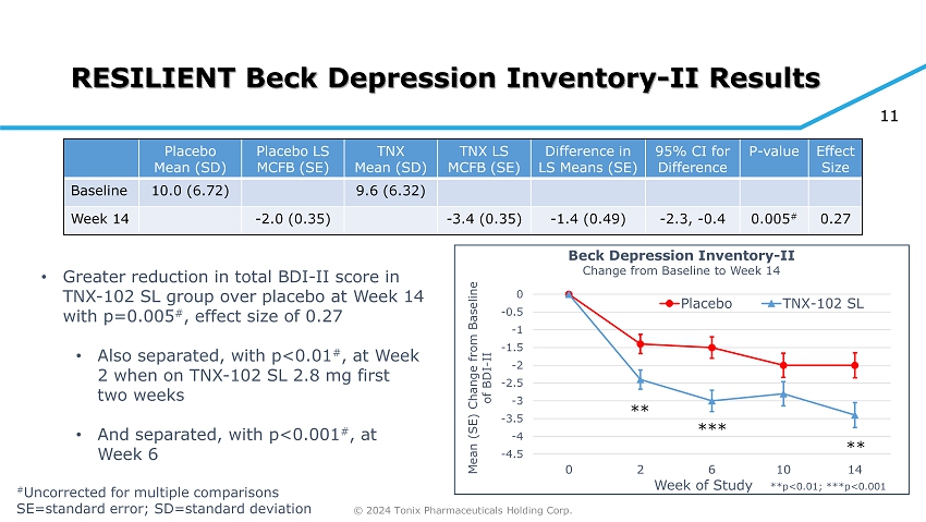 © 2024 Tonix Pharmaceuticals Holding Corp. 10 RESILIENT Key Secondary Outcome Measures Met** Week 14 p - value Rating Scale*  p = 0.00013 ^ Patient Global Impression of Change (PGIC)  p = 0.000002 # Fibromyalgia Impact Questionnaire - Symptoms  p = 0.001 # Fibromyalgia Impact Questionnaire - Function  p = 0.0000001 # PROMIS Sleep Disturbance  p = 0.00009 # PROMIS Fatigue  p = 0.0007 # Weekly average of daily Sleep Quality scores *In order of statistical serial gate - keeping hierarchy (or “waterfall”) to control overall Type 1 error **Statistical significance met ^ Based on a Pearson Chi - Squared with differences in proportions from Z - test; responders defined as subject that reply ‘very much improved’ or ‘much improved’ at Week 14; all others are non - responders # Based on Mixed Model Repeated Measures with Multiple Imputation, with fixed categorical effects of treatment, center, study w ee k, and treatment by study week interaction, as well as baseline value and baseline value - by - study week interaction. Six Out of the Six Key Secondary Measures Met Statistical Significance