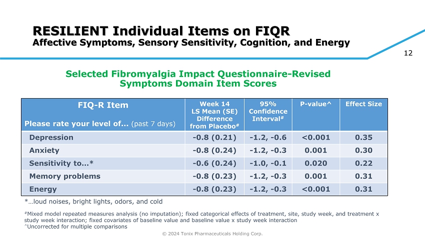 © 2024 Tonix Pharmaceuticals Holding Corp. 11 RESILIENT Beck Depression Inventory - II Results Effect Size P - value 95% CI for Difference Difference in LS Means (SE) TNX LS MCFB (SE) TNX Mean (SD) Placebo LS MCFB (SE) Placebo Mean (SD) 9.6 (6.32) 10.0 (6.72) Baseline 0.27 0.005 # - 2.3, - 0.4 - 1.4 (0.49) - 3.4 (0.35) - 2.0 (0.35) Week 14 -4.5 -4 -3.5 -3 -2.5 -2 -1.5 -1 -0.5 0 0 2 6 10 14 Mean (SE) Change from Baseline of BDI - II Week of Study Beck Depression Inventory - II Change from Baseline to Week 14 Placebo TNX-102 SL **p<0.01; ***p<0.001 ** *** ** • Greater reduction in total BDI - II score in TNX - 102 SL group over placebo at Week 14 with p=0.005 # , effect size of 0.27 • Also separated, with p<0.01 # , at Week 2 when on TNX - 102 SL 2.8 mg first two weeks • And separated, with p<0.001 # , at Week 6 # Uncorrected for multiple comparisons SE=standard error; SD=standard deviation