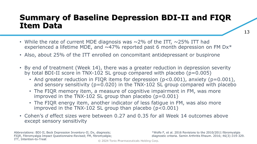 © 2024 Tonix Pharmaceuticals Holding Corp. 12 RESILIENT Individual Items on FIQR Affective Symptoms, Sensory Sensitivity, Cognition, and Energy Selected Fibromyalgia Impact Questionnaire - Revised Symptoms Domain Item Scores Effect Size P - value^ 95% Confidence Interval # Week 14 LS Mean (SE) Difference from Placebo # FIQ - R Item Please rate your level of... (past 7 days) 0.35 <0.001 - 1.2, - 0.6 - 0.8 (0.21) Depression 0.30 0.001 - 1.2, - 0.3 - 0.8 (0.24) Anxiety 0.22 0.020 - 1.0, - 0.1 - 0.6 (0.24) Sensitivity to…* 0.31 0.001 - 1.2, - 0.3 - 0.8 (0.23) Memory problems 0.31 <0.001 - 1.2, - 0.3 - 0.8 (0.23) Energy *…loud noises, bright lights, odors, and cold # Mixed model repeated measures analysis (no imputation); fixed categorical effects of treatment, site, study week, and treatme nt x study week interaction; fixed covariates of baseline value and baseline value x study week interaction ^ Uncorrected for multiple comparisons