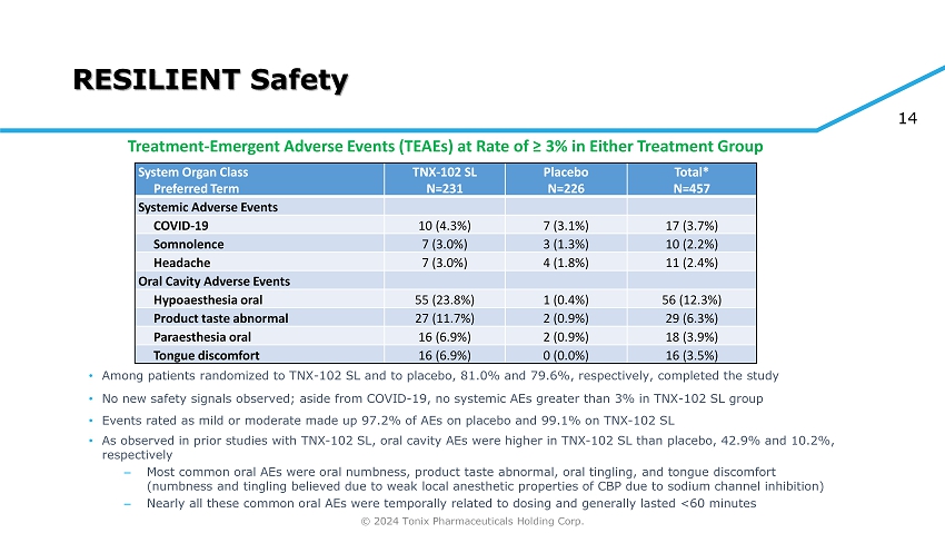 © 2024 Tonix Pharmaceuticals Holding Corp. 13 Summary of Baseline Depression BDI - II and FIQR Item Data • While the rate of current MDE diagnosis was ~2% of the ITT, ~25% ITT had experienced a lifetime MDE, and ~47% reported past 6 month depression on FM Dx* • Also, about 25% of the ITT enrolled on concomitant antidepressant or buspirone • By end of treatment (Week 14), there was a greater reduction in depression severity by total BDI - II score in TNX - 102 SL group compared with placebo (p=0.005) • And greater reduction in FIQR items for depression (p<0.001), anxiety (p=0.001), and sensory sensitivity (p=0.020) in the TNX - 102 SL group compared with placebo • The FIQR memory item, a measure of cognitive impairment in FM, was more improved in the TNX - 102 SL group than placebo (p=0.001) • The FIQR energy item, another indicator of less fatigue in FM, was also more improved in the TNX - 102 SL group than placebo (p<0.001) • Cohen’s d effect sizes were between 0.27 and 0.35 for all Week 14 outcomes above except sensory sensitivity *Wolfe F, et al. 2016 Revisions to the 2010/2011 fibromyalgia diagnostic criteria. Semin Arthritis Rheum. 2016; 46(3):319 - 329. Abbreviations: BDI - II, Beck Depression Inventory - II; Dx, diagnosis; FIQR, Fibromyalgia Impact Questionnaire - Revised; FM, fibromyalgia; ITT, Intention - to - Treat