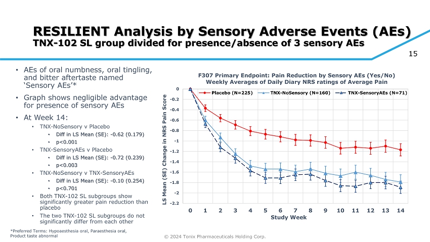 © 2024 Tonix Pharmaceuticals Holding Corp. 14 RESILIENT Safety Total* N=457 Placebo N=226 TNX - 102 SL N=231 System Organ Class Preferred Term Systemic Adverse Events 17 (3.7%) 7 (3.1%) 10 (4.3%) COVID - 19 10 (2.2%) 3 (1.3%) 7 (3.0%) Somnolence 11 (2.4%) 4 (1.8%) 7 (3.0%) Headache Oral Cavity Adverse Events 56 (12.3%) 1 (0.4%) 55 (23.8%) Hypoaesthesia oral 29 (6.3%) 2 (0.9%) 27 (11.7%) Product taste abnormal 18 (3.9%) 2 (0.9%) 16 (6.9%) Paraesthesia oral 16 (3.5%) 0 (0.0%) 16 (6.9%) Tongue discomfort • Among patients randomized to TNX - 102 SL and to placebo, 81.0% and 79.6%, respectively, completed the study • No new safety signals observed; aside from COVID - 19, no systemic AEs greater than 3% in TNX - 102 SL group • Events rated as mild or moderate made up 97.2% of AEs on placebo and 99.1% on TNX - 102 SL • As observed in prior studies with TNX - 102 SL, oral cavity AEs were higher in TNX - 102 SL than placebo, 42.9% and 10.2%, respectively ‒ Most common oral AEs were oral numbness, product taste abnormal, oral tingling, and tongue discomfort (numbness and tingling believed due to weak local anesthetic properties of CBP due to sodium channel inhibition) ‒ Nearly all these common oral AEs were temporally related to dosing and generally lasted <60 minutes Treatment - Emergent Adverse Events (TEAEs) at Rate of ≥ 3% in Either Treatment Group