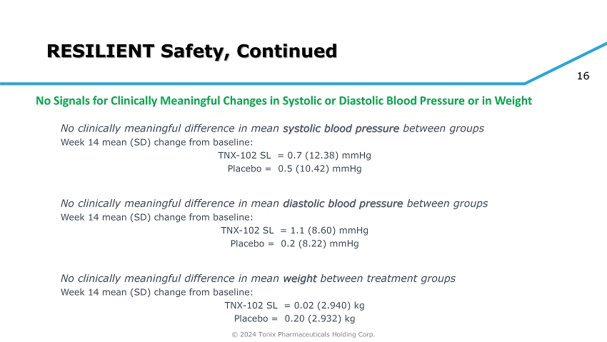 © 2024 Tonix Pharmaceuticals Holding Corp. 15 RESILIENT Analysis by Sensory Adverse Events (AEs) TNX - 102 SL group divided for presence/absence of 3 sensory AEs • AEs of oral numbness, oral tingling, and bitter aftertaste named ‘Sensory AEs’* • Graph shows negligible advantage for presence of sensory AEs • At Week 14: • TNX - NoSensory v Placebo • Diff in LS Mean (SE): - 0.62 (0.179) • p<0.001 • TNX - SensoryAEs v Placebo • Diff in LS Mean (SE): - 0.72 (0.239) • p<0.003 • TNX - NoSensory v TNX - SensoryAEs • Diff in LS Mean (SE): - 0.10 (0.254) • p<0.701 • Both TNX - 102 SL subgroups show significantly greater pain reduction than placebo • The two TNX - 102 SL subgroups do not significantly differ from each other -2.2 -2 -1.8 -1.6 -1.4 -1.2 -1 -0.8 -0.6 -0.4 -0.2 0 0 1 2 3 4 5 6 7 8 9 10 11 12 13 14 LS Mean (SE) Change in NRS Pain Score Study Week F307 Primary Endpoint: Pain Reduction by Sensory AEs (Yes/No) Weekly Averages of Daily Diary NRS ratings of Average Pain Placebo (N=225) TNX-NoSensory (N=160) TNX-SensoryAEs (N=71) *Preferred Terms: Hypoaesthesia oral, Paraesthesia oral, Product taste abnormal