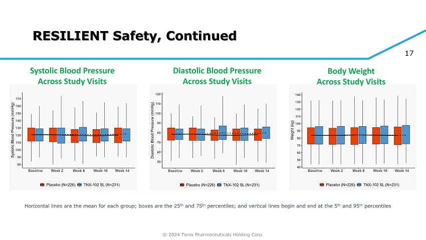 © 2024 Tonix Pharmaceuticals Holding Corp. 16 RESILIENT Safety, Continued No clinically meaningful difference in mean systolic blood pressure between groups Week 14 mean (SD) change from baseline: TNX - 102 SL = 0.7 (12.38) mmHg Placebo = 0.5 (10.42) mmHg No clinically meaningful difference in mean diastolic blood pressure between groups Week 14 mean (SD) change from baseline: TNX - 102 SL = 1.1 (8.60) mmHg Placebo = 0.2 (8.22) mmHg No clinically meaningful difference in mean weight between treatment groups Week 14 mean (SD) change from baseline: TNX - 102 SL = 0.02 (2.940) kg Placebo = 0.20 (2.932) kg No Signals for Clinically Meaningful Changes in Systolic or Diastolic Blood Pressure or in Weight