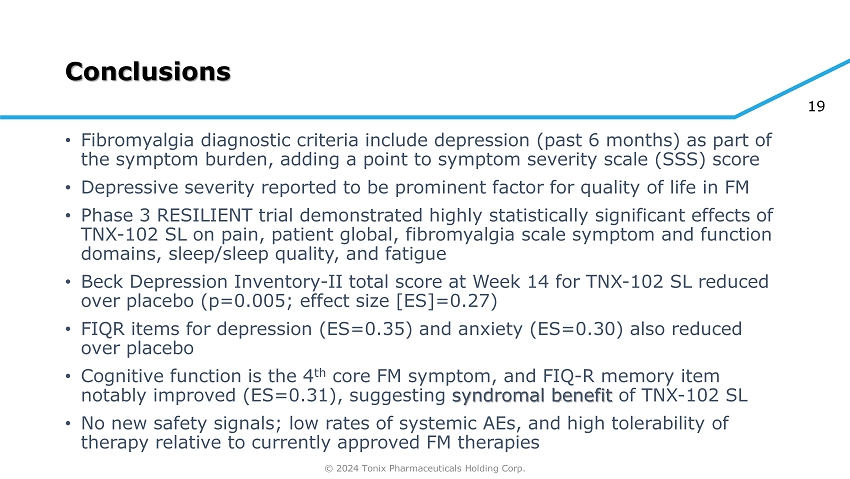 © 2024 Tonix Pharmaceuticals Holding Corp. 18 Tolerability – Sexual Functioning • No AEs of sexual dysfunction in RESILIENT • Sexual functioning also systematically investigated using the Changes in Sexual Functioning Questionnaire short form (CSFQ - 14) at Baseline and Week 14 • In females, improved scores on CSFQ - 14 (indicating better sexual functioning) for TNX - 102 SL group compared with placebo: • Total CSRQ - 14 score: p=0.010 • Orgasm/Completion item score: p=0.007 • Desire/Frequency score item score: p=0.010 • Tolerability advantage over approved FM pharmacotherapies with serotonergic reuptake inhibition such as SNRIs • Most co mmon sexual side effects of such medications are delay in orgasm or anorgasmia, the function that was most improved on TNX - 102 SL in RESILIENT Pleasure Desire/Frequency Desire/Interest Arousal/Excitement Orgasm/Completion Desire Total Total Score 0.1 [ - 0.0, 0.30] [192/201] 0.3 [0.10, 0.5] [192/204] 0.0 [ - 0.3, 0.4] [192/204] 0.3 [ - 0.10, 0.60] [192/204] 0.6 [0.2, 1.0] [192/204] 0.3 [ - 0.10, 0.80] [192/204] 1.4 [0.30, 2.5] [192/201] LS Mean Difference [95% CI] [PBO/TNX 5.6mg] -1 -0.5 0 0.5 1 1.5 2 2.5 3 3.5 ANCOVA analysis: comparison between groups (TNX - 102 SL 5.6 mg vs. Placebo) Red Diamond refers to treatment differences with p <0.05, not corrected for multiple comparisons Changes in Sexual Functioning Questionnaire Change from Baseline to Week 14