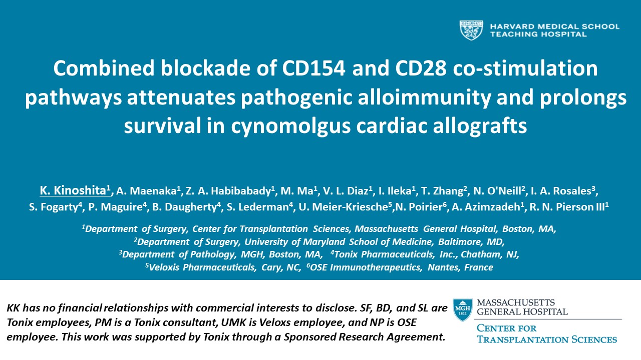Combined blockade of CD154 and CD28 co - stimulation pathways attenuates pathogenic alloimmunity and prolongs survival in cynomolgus cardiac allografts K. Kinoshita 1 , A. Maenaka 1 , Z. A. Habibabady 1 , M. Ma 1 , V. L. Diaz 1 , I. Ileka 1 , T. Zhang 2 , N. O'Neill 2 , I. A. Rosales 3 , S. Fogarty 4 , P. Maguire 4 , B. Daugherty 4 , S. Lederman 4 , U. Meier - Kriesche 5 ,N. Poirier 6 , A. Azimzadeh 1 , R. N. Pierson III 1 1 Department of Surgery, Center for Transplantation Sciences, Massachusetts General Hospital, Boston, MA, 2 Department of Surgery, University of Maryland School of Medicine, Baltimore, MD, 3 Department of Pathology, MGH, Boston, MA, 4 Tonix Pharmaceuticals, Inc., Chatham, NJ, 5 Veloxis Pharmaceuticals, Cary, NC, 6 OSE Immunotherapeutics , Nantes, France KK has no financial relationships with commercial interests to disclose. SF, BD, and SL are Tonix employees, PM is a Tonix consultant, UMK is Veloxs employee, and NP is OSE employee. This work was supported by Tonix through a Sponsored Research Agreement.