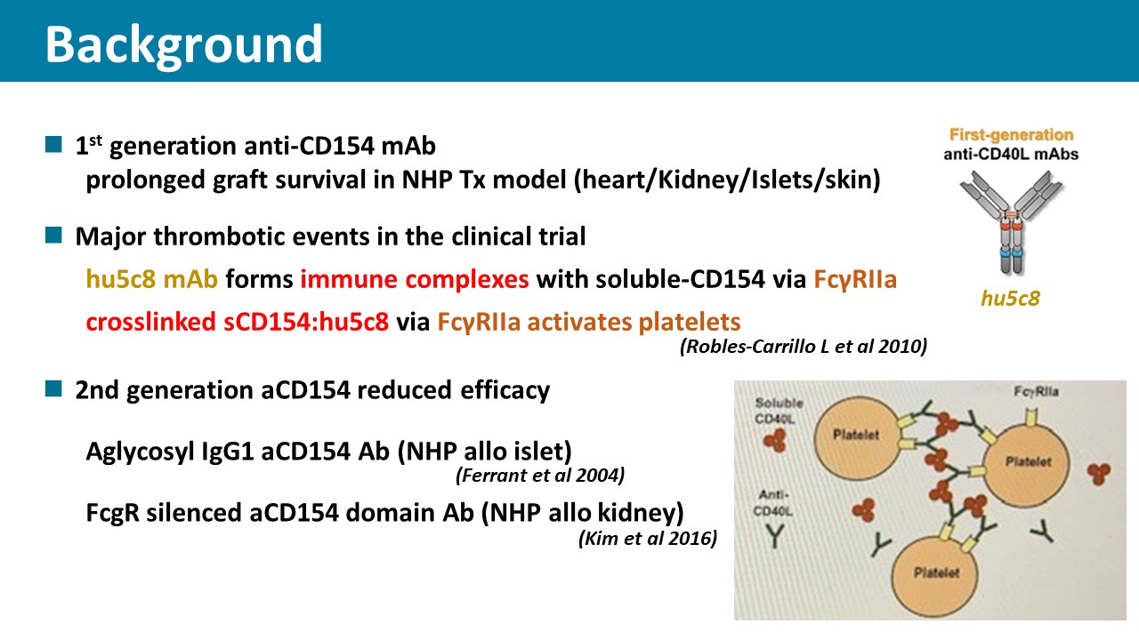 hu5c8  1 st generation anti - CD154 mAb prolonged graft survival in NHP Tx model ( h eart /Kidney/ Islets /skin)  Major thrombotic events in the clinical trial hu5c8 m Ab forms immune complexes with soluble - CD154 via Fc γ RIIa crosslinked s CD154:hu5c8 via Fc γ RIIa a ctivates platelets Background  2nd generation aCD154 reduced efficacy Aglycosyl IgG1 aCD154 Ab (NHP allo islet) FcgR silenced aCD154 domain Ab (NHP allo kidney) ( Ferrant et al 2004) (Kim et al 2016) (Robles - Carrillo L et al 2010)