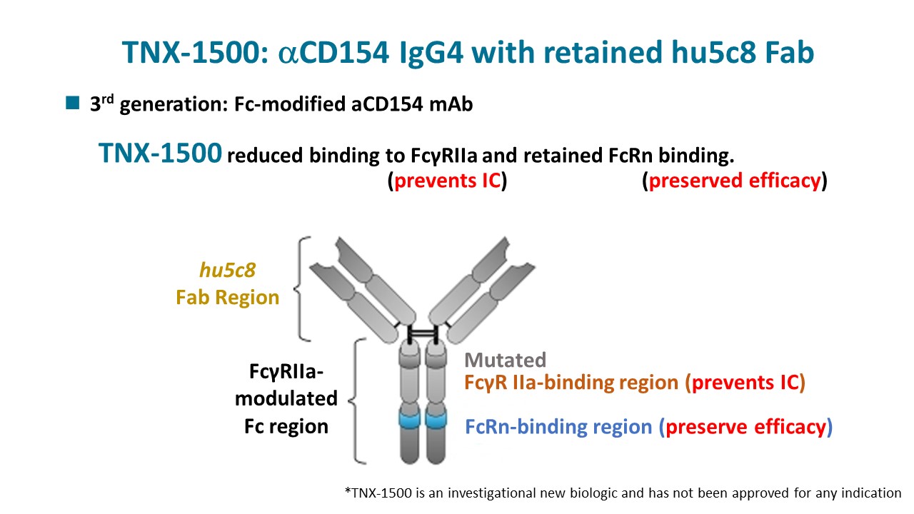 hu5c8 Fab Region Fc γ RIIa - modulated Fc region Mutated Fc γ R IIa - binding region ( prevents IC ) FcRn - binding region ( preserve efficacy ) *TNX - 1500 is an investigational new biologic and has not been approved for any indication  3 rd generation: Fc - modified aCD154 mAb TNX - 1500 reduced binding to Fc γ RIIa and retained FcRn binding. ( prevents IC ) ( preserved efficacy ) TNX - 1500:  CD154 IgG4 with retained hu5c8 Fab