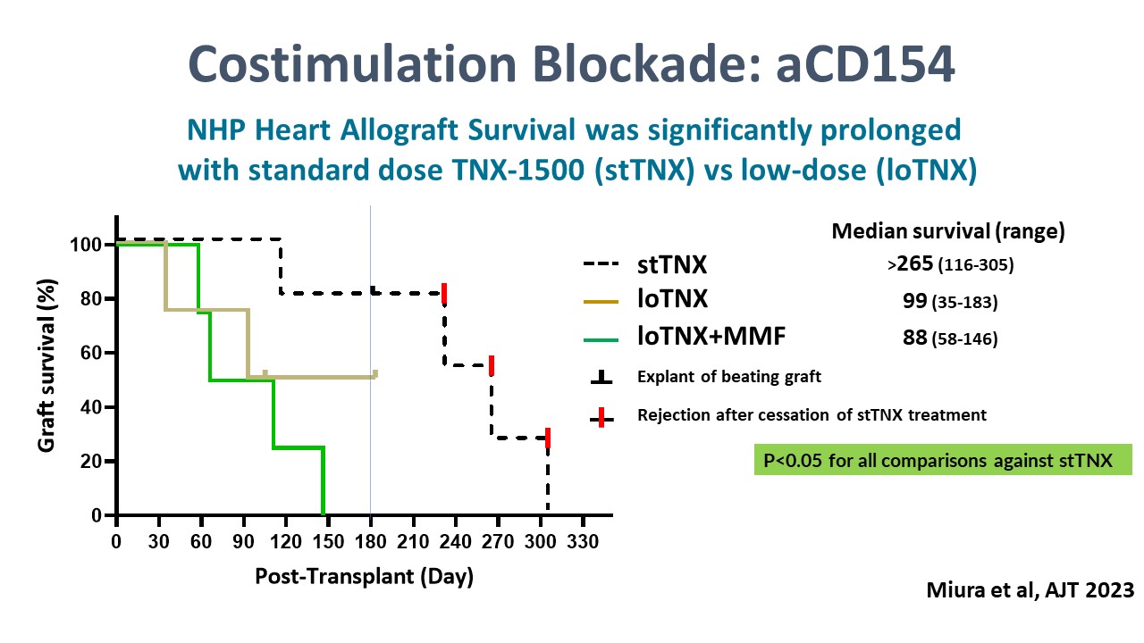 Costimulation Blockade: a CD154 NHP Heart Allograft Survival was significantly prolonged with standard dose TNX - 1500 ( stTNX ) vs low - dose ( loTNX ) > 265 (116 - 305) 99 (35 - 183) 88 (58 - 146) Rejection after cessation of stTNX treatment Explant of beating graft P<0.05 for all comparisons against stTNX Miura et al, AJT 2023 0 30 60 90 120 150180 210240 270300 330 0 20 40 60 80 100 Post-Transplant (Day) G r a f t s u r v i v a l ( % ) stTNX loTNX loTNX+MMF Median survival ( range )