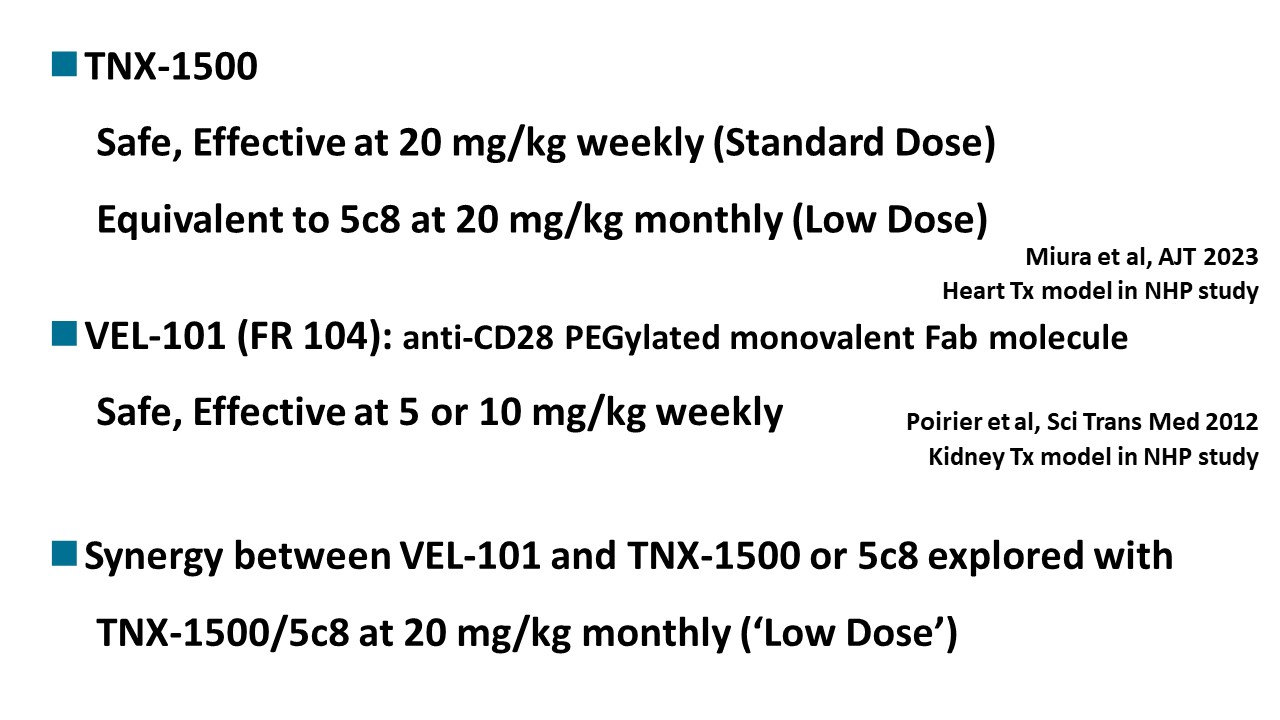  TNX - 1500 S afe , Effective at 20 mg/kg wee kly (Standard Dose) Equivalent to 5c8 at 20 mg/kg monthly (Low Dose) Miura et al, AJT 2023 Heart Tx model in NHP study Poirier et al, Sci Trans Med 2012 Kidney Tx model in NHP study  VEL - 101 (FR 104): anti - CD28 PEGylated monovalent Fab molecule Safe, Effective at 5 or 10 mg/kg weekly  Synergy between VEL - 101 and TNX - 1500 or 5c8 explored with TNX - 1500/5c8 at 20 mg/kg monthly (‘Low Dose’)RK0