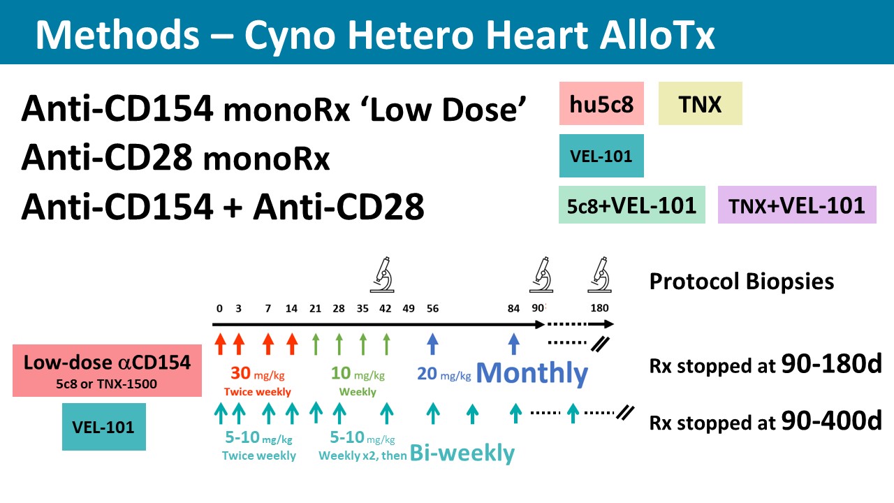 or 5 - 10 mg/kg Twice weekly 5 - 1 0 mg/kg Weekly x2, then Bi - weekly Rx stopped at 90 - 180d Protocol Biopsies Rx stopped at 90 - 400d Low - dose  CD154 5c8 or TNX - 1500 VEL - 101 Anti - CD154 monoRx ‘Low Dose’ Anti - CD28 monoRx Anti - CD154 + Anti - CD28 hu5c8 TNX VEL - 101 TNX +VEL - 101 5c8 +VEL - 101 Methods – Cyno Hetero Heart AlloTx
