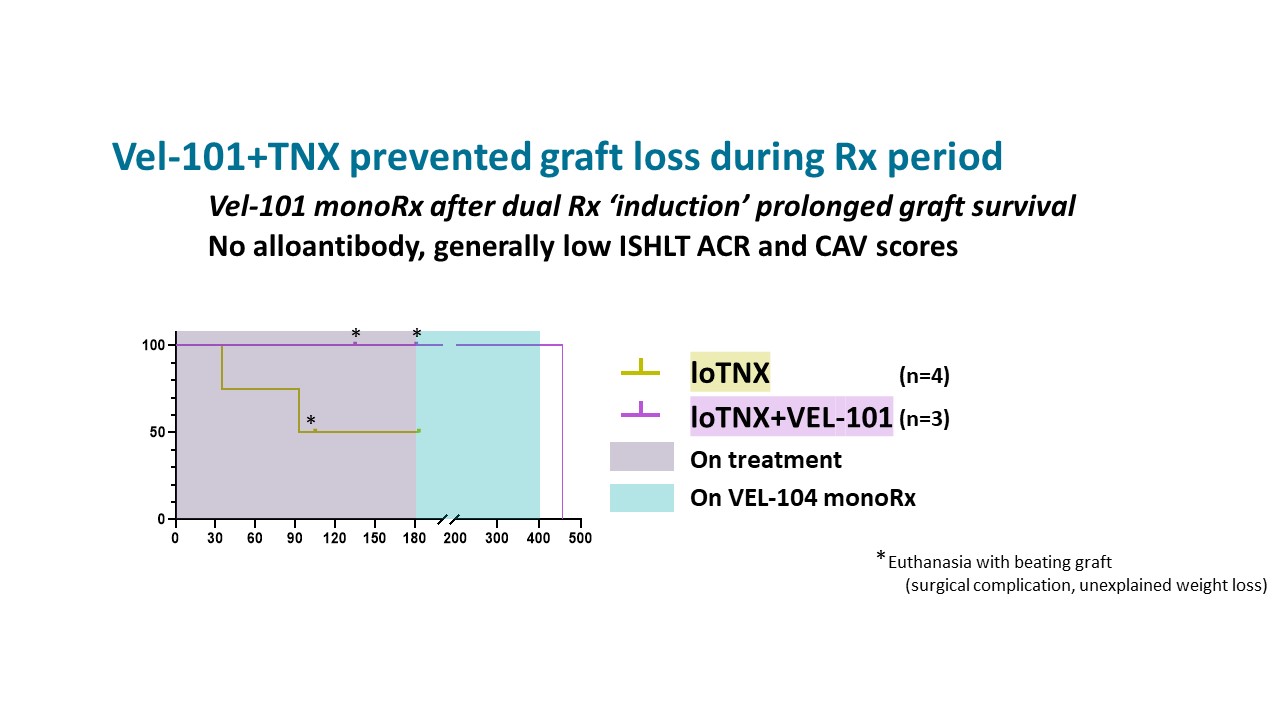 loTNX loTNX+VEL - 101 On treatment On VEL - 104 monoRx * * * Euthanasia with beating graft (surgical complication, unexplained weight loss) * (n=4) (n=3) Vel - 101+TNX prevented graft loss during Rx period Vel - 101 monoRx after dual Rx ‘induction’ prolonged graft survival No alloantibody, generally low ISHLT ACR and CAV scores