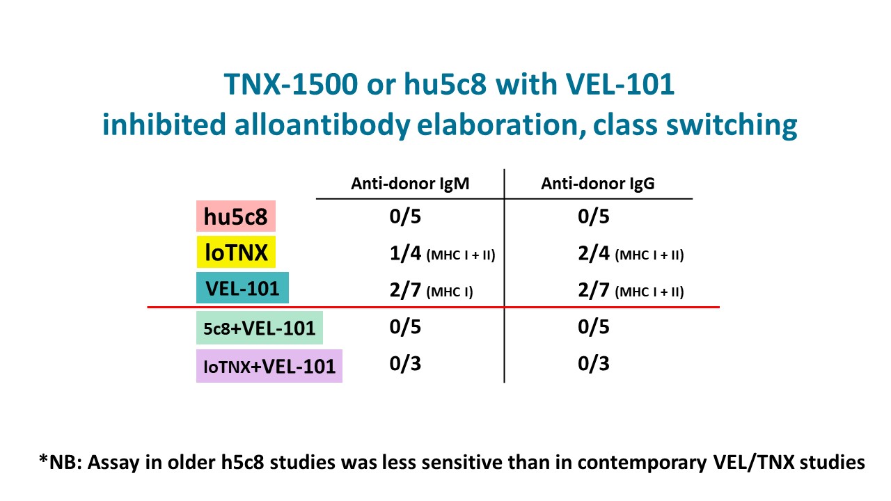loTNX loTNX +VEL - 101 5c8 +VEL - 101 hu5c8 VEL - 101 Anti - donor IgG Anti - donor IgM 0/5 0/5 2/4 (MHC I + II) 1/4 (MHC I + II) 2/7 (MHC I + II) 2/7 (MHC I) 0/5 0/5 0/3 0/3 TNX - 1500 or hu5c8 with VEL - 101 inhibited alloantibody elaboration, class switching *NB: Assay in older h5c8 studies was less sensitive than in contemporary VEL/TNX studies