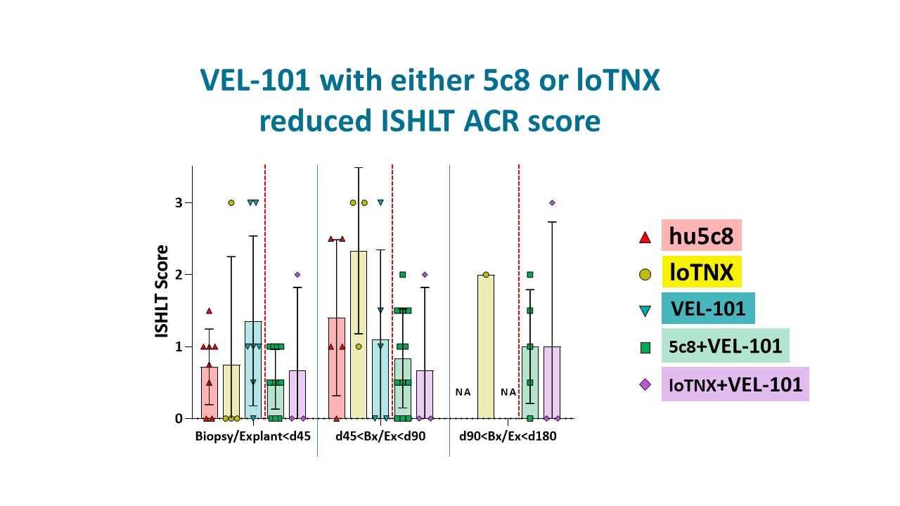 Biopsy/Explant<d45 d45<Bx/Ex<d90 d90<Bx/Ex<d180 After off Rx 0 1 2 3 I S H L T S c o r e NA NA NA loTNX loTNX +VEL - 101 5c8 +VEL - 101 hu5c8 VEL - 101 VEL - 101 with either 5c8 or loTNX reduced ISHLT ACR score