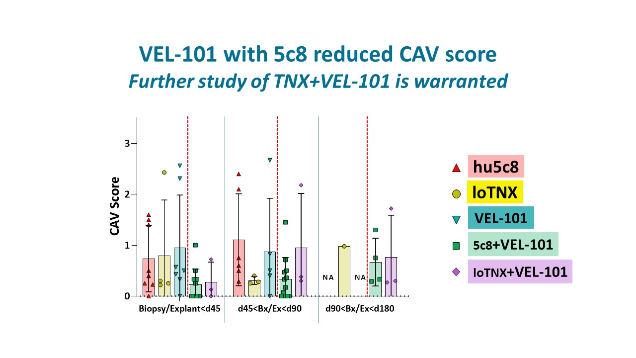 Biopsy/Explant<d45 d45<Bx/Ex<d90 d90<Bx/Ex<d180 After off Rx 0 1 2 3 C A V S c o r e NA NA NA loTNX loTNX +VEL - 101 5c8 +VEL - 101 hu5c8 VEL - 101 VEL - 101 with 5c8 reduced CAV score F urther study of TNX+VEL - 101 is warranted