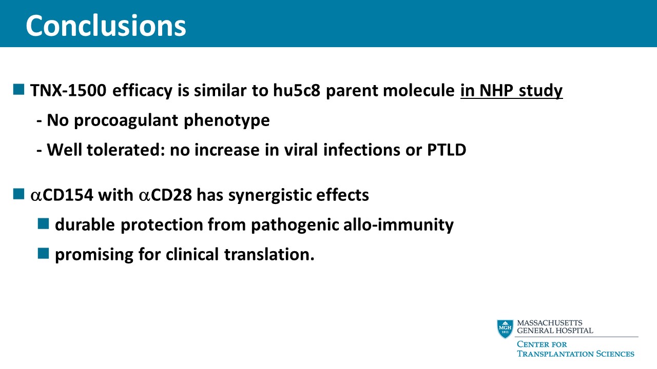  TNX - 1500 efficacy is similar to hu5c8 parent molecule in NHP study - No procoagulant phenotype - Well tolerated: no increase in viral infections or PTLD   CD154 with  CD28 has synergistic effects  durable protection from pathogenic allo - immunity  promising for clinical translation. Conclusions RK0
