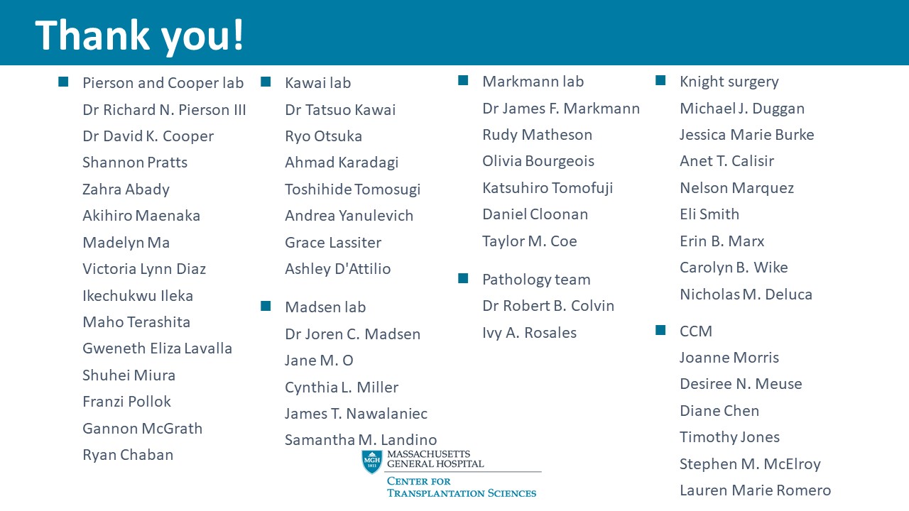  Pierson and Cooper lab Dr Richard N. Pierson III Dr David K. Cooper Shannon Pratts Zahra Abady Akihiro Maenaka Madelyn Ma Victoria Lynn Diaz Ikechukwu Ileka Maho Terashita Gweneth Eliza Lavalla Shuhei Miura Franzi Pollok Gannon McGrath Ryan Chaban Thank you!  Kawai lab Dr Tatsuo Kawai Ryo Otsuka Ahmad Karadagi Toshihide Tomosugi Andrea Yanulevich Grace Lassiter Ashley D'Attilio  Madsen lab Dr Joren C. Madsen Jane M. O Cynthia L. Miller James T. Nawalaniec Samantha M. Landino  Markmann lab Dr James F. Markmann Rudy Matheson Olivia Bourgeois Katsuhiro Tomofuji Daniel Cloonan Taylor M. Coe  Pathology team Dr Robert B. Colvin Ivy A. Rosales  Knight surgery Michael J. Duggan Jessica Marie Burke Anet T. Calisir Nelson Marquez Eli Smith Erin B. Marx Carolyn B. Wike Nicholas M. Deluca  CCM Joanne Morris Desiree N. Meuse Diane Chen Timothy Jones Stephen M. McElroy Lauren Marie Romero
