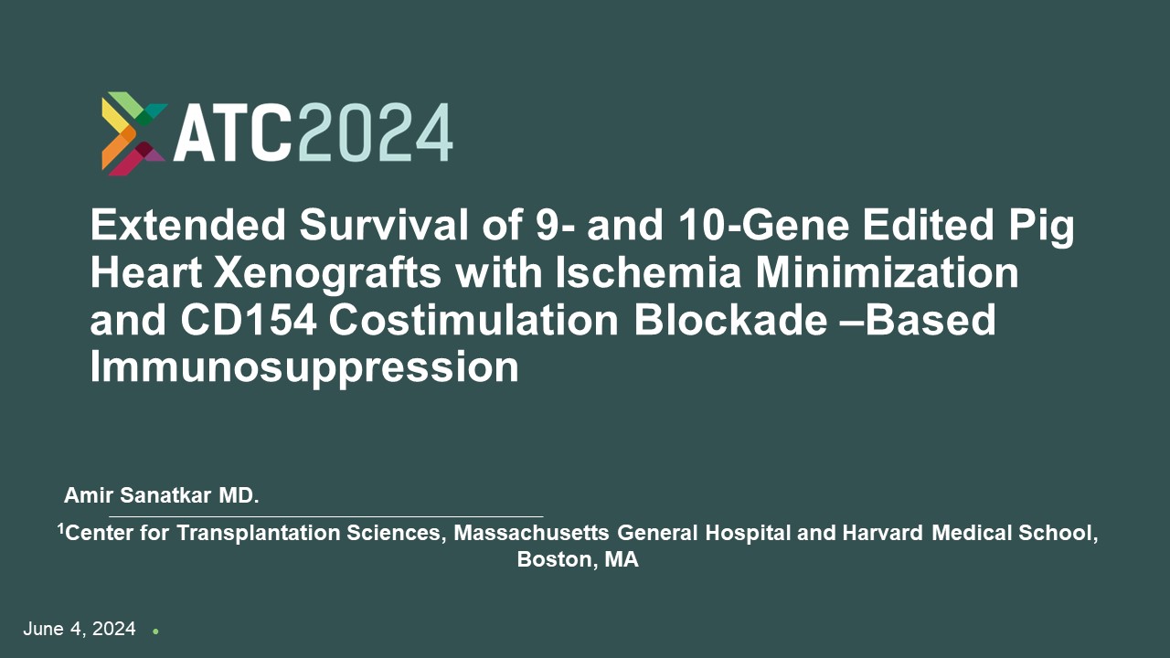 Extended Survival of 9 - and 10 - Gene Edited Pig Heart Xenografts with Ischemia Minimization and CD154 Costimulation Blockade – Based Immunosuppression June 4, 2024 Ɣ Amir Sanatkar MD. 1 Center for Transplantation Sciences, Massachusetts General Hospital and Harvard Medical School, Boston, MA