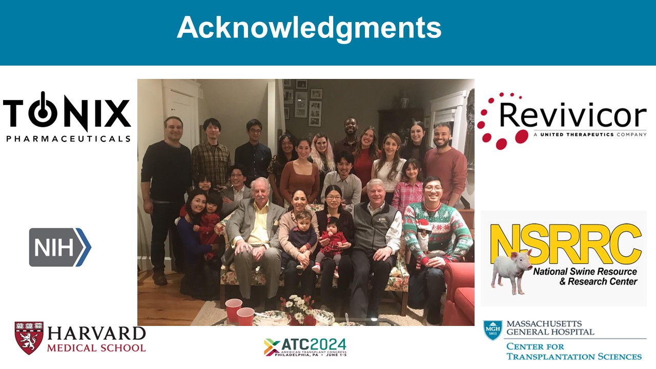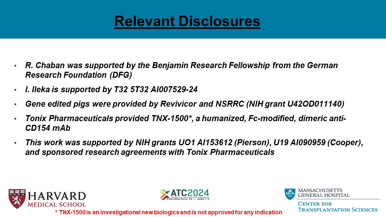 Relevant Disclosures • R. Chaban was supported by the Benjamin Research Fellowship from the German Research Foundation (DFG) • I. Ileka is supported by T32 5T32 AI007529 - 24 • Gene edited pigs were provided by Revivicor and NSRRC (NIH grant U42OD011140) • Tonix Pharmaceuticals provided TNX - 1500*, a humanized, Fc - modified, dimeric anti - CD154 mAb • This work was supported by NIH grants UO1 AI153612 (Pierson), U19 AI090959 (Cooper), and sponsored research agreements with Tonix Pharmaceuticals * TNX - 1500 is an investigational new biologics and is not approved for any indication