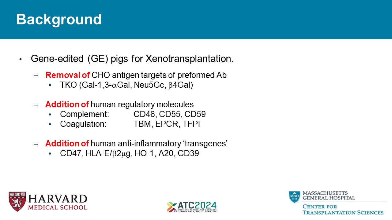 Background • Gene - edited (GE) pigs for Xenotransplantation. – Removal of CHO antigen targets of preformed Ab • TKO (Gal - 1,3 -  Gal, Neu5Gc,  4Gal) – Addition of human regulatory molecules • Complement: CD46, CD55, CD59 • Coagulation: TBM, EPCR, TFPI – Addition of human anti - inflammatory ‘transgenes’ • CD47, HLA - E/  2  g, HO - 1, A20, CD39