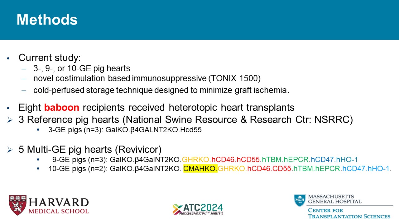Methods • Current study: – 3 - , 9 - , or 10 - GE pig hearts – novel costimulation - based immunosuppressive (TONIX - 1500) – cold - perfused storage technique designed to minimize graft ischemia . • Eight baboon recipients received heterotopic heart transplants » 3 Reference pig hearts (National Swine Resource & Research Ctr: NSRRC) • 3 - GE pigs (n=3): GalKO . β4 GALNT2KO.Hcd55 » 5 Multi - GE pig hearts ( Revivicor ) • 9 - GE pigs (n=3): GalKO . β4 GalNT2KO. GHRKO. hCD46.hCD55 . hTBM.hEPCR . hCD47 .hHO - 1 • 10 - GE pigs (n=2): GalKO . β4 GalNT2KO. CMAHKO. GHRKO. hCD46.CD55 . hTBM.hEPCR . hCD47.hHO - 1 .