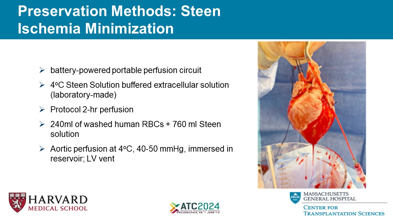 Preservation Methods: Steen Ischemia Minimization 5 » battery - powered portable perfusion circuit » 4 o C Steen Solution buffered extracellular solution (laboratory - made) » Protocol 2 - hr perfusion » 240ml of washed human RBCs + 760 ml Steen solution » Aortic perfusion at 4 o C, 40 - 50 mmHg, immersed in reservoir; LV vent
